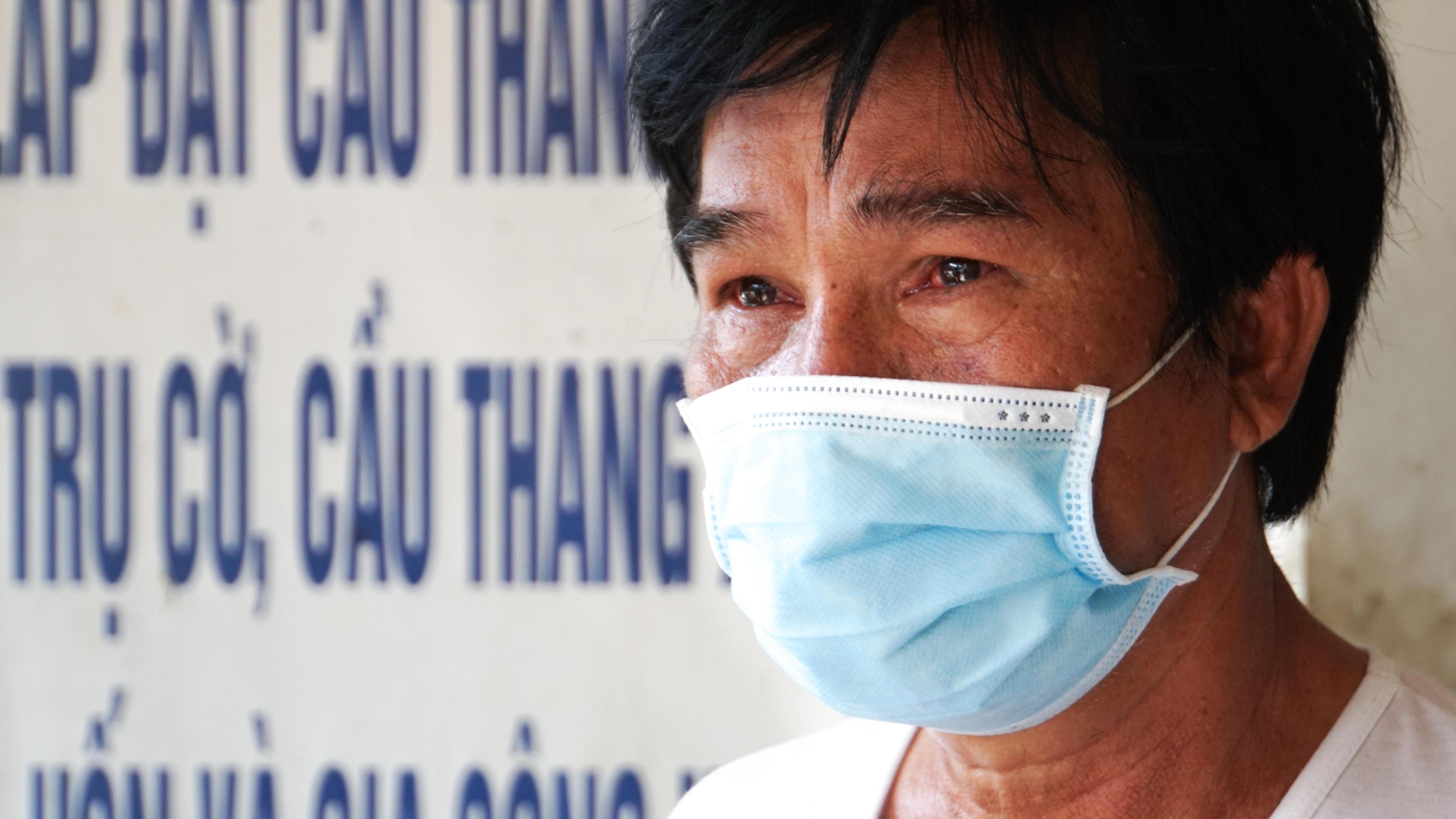 Ông Bùi Quang Long, cha của chị Bùi T.T.T, không cầm được nước mắt. |