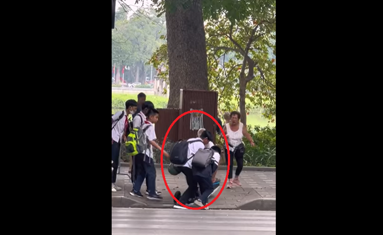 Các em học sinh cùng nhau giúp đỡ người già ở khu vực Hồ Gươm, Hà Nội. (Ảnh cắt từ clip) |