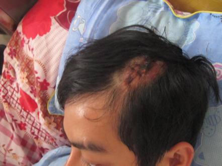 Ngày 24/3, tại bệnh viện, anh Nguyễn Võ Thuận (SN 1990, trú tại xã Phú Sơn, Tân Kỳ, Nghệ An) vẫn chưa hết bức xúc khi đang được điều trị bệnh viện tỉnh với vết thương khâu 8 mũi ở đầu và đang tiếp tục theo dõi chấn thương sọ não, tố nhà xe hành hung.