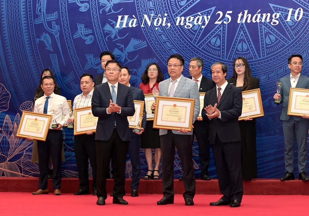 Phó Thủ tướng Chính phủ Lê Thành Long và Bộ trưởng Bộ Giáo dục và Đào tạo Nguyễn Kim Sơn tôn vinh các doanh nghiệp tích cực đóng góp trong giai đoạn 2013 - 2023. |