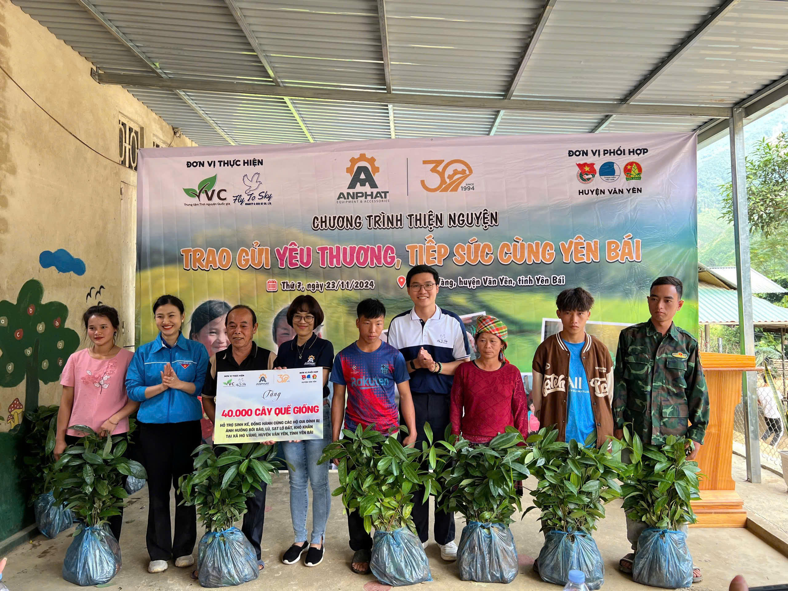 Văn Phúc (áo trắng ở giữa) tham gia trao tặng cây quế sinh kế cho bà con bị ảnh hưởng bão lũ, sạt lở tại Văn Yên, Yên Bái - Ảnh: NVCC |