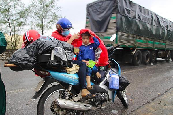 Suốt những ngày qua, anh Cương cũng luôn phải căng mắt, cầm chắc tay lái chở vợ con vượt hàng trăm cây số. “Chạy xe đường dài mà thời tiết lúc nắng, lúc mưa đi rất nguy hiểm, ngồi trên xe mà người mỏi gần như tê dại, thương nhất là con nhỏ sợ dầm mưa lại bị cảm cúm dọc đường.