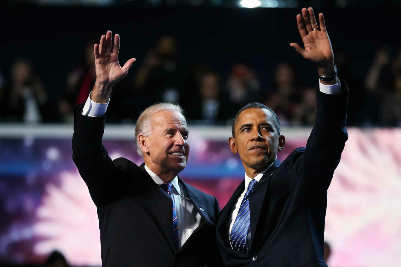 Barack Obama, Michelle Obama cùng Joe Biden và Jill Biden vẫy chào đám đông sau bài phát biểu nhận chức tổng thống của Barack Obama tại bữa tiệc đêm bầu cử ở Chicago vào ngày 4/11/2008.
