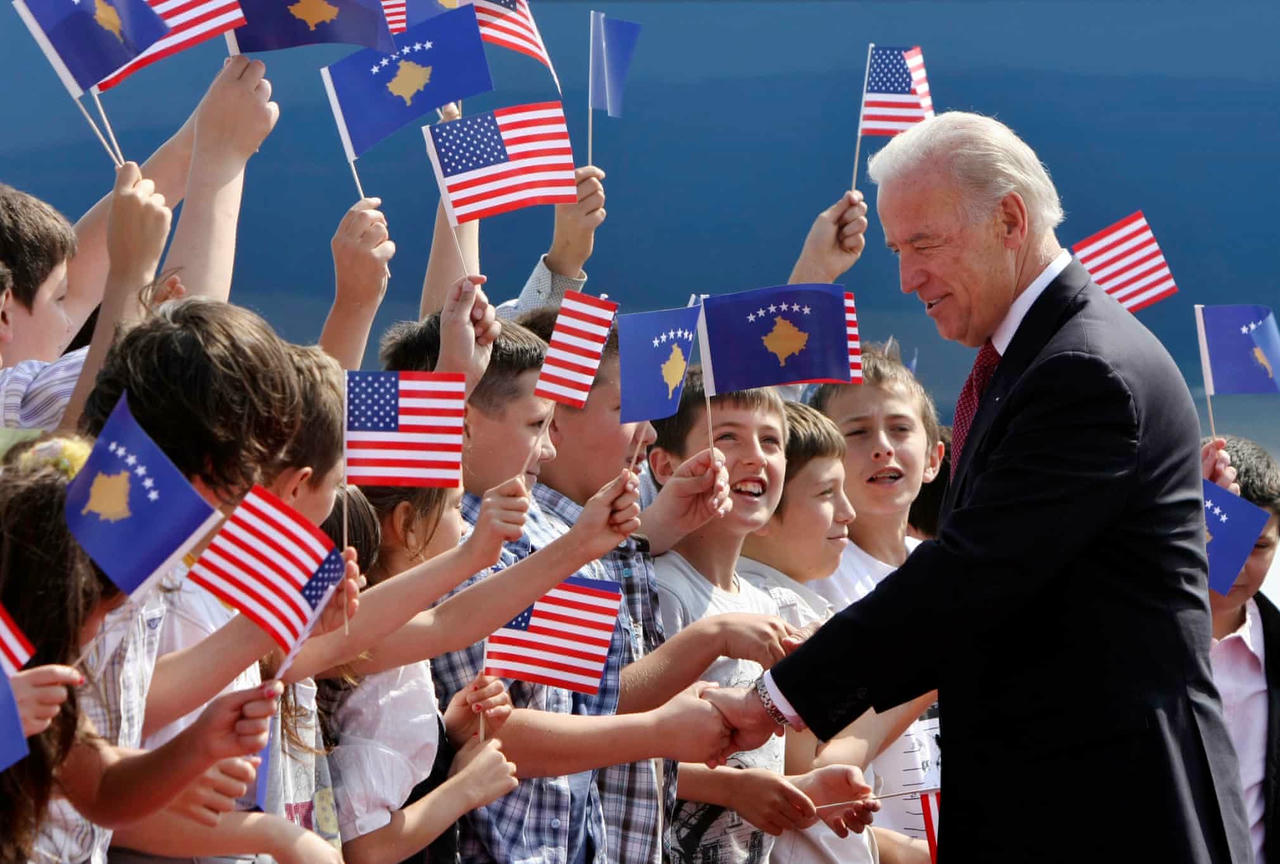 Trẻ em cổ vũ và vẫy cờ khi Joe Biden đến Pristina, Kosovo, ngày 21/5/2009.