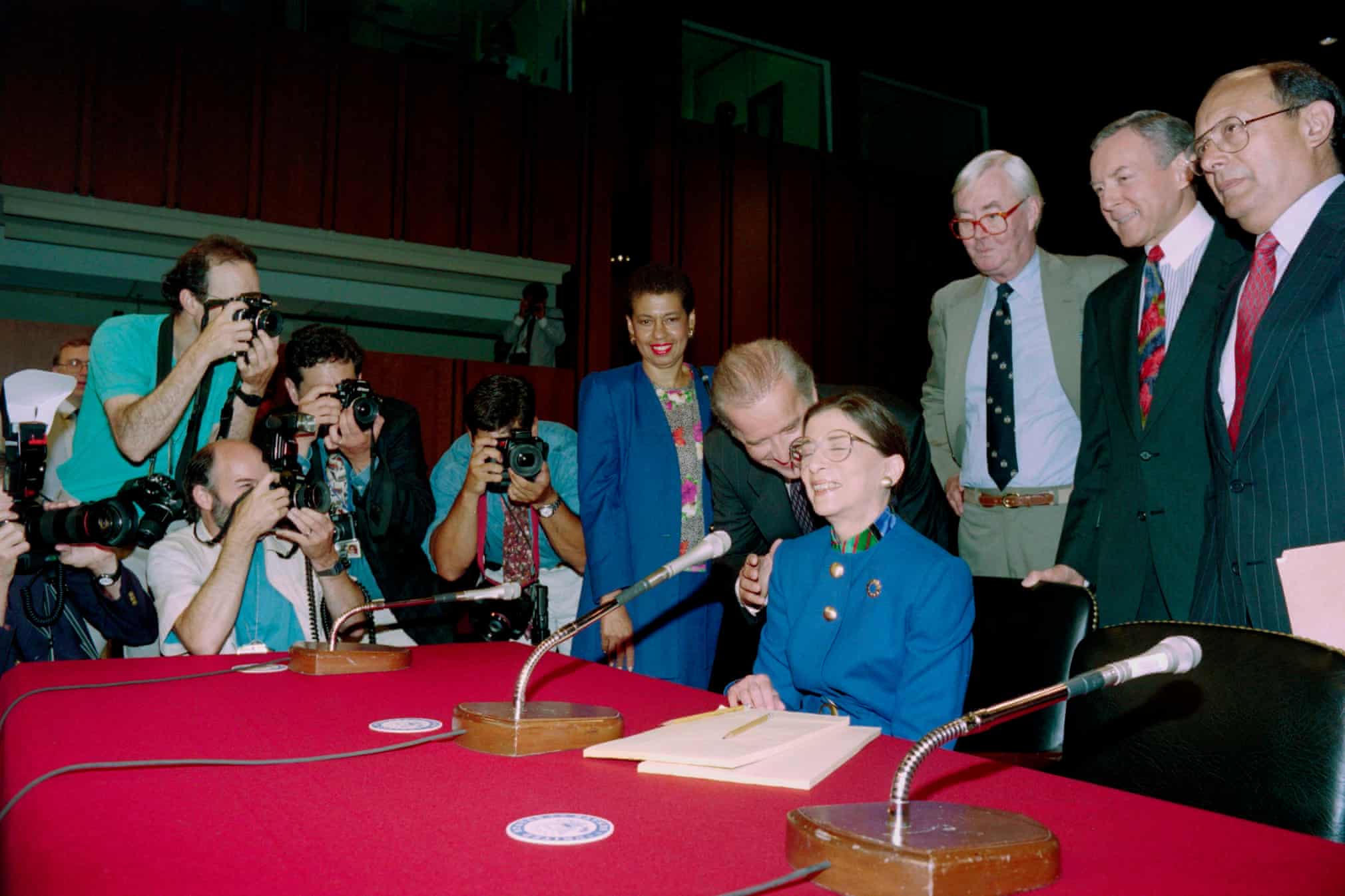Biden nói chuyện với Ruth Bader Ginsburg ngay trước phiên điều trần xác nhận của tòa án tối cao vào ngày 20/7/1993.