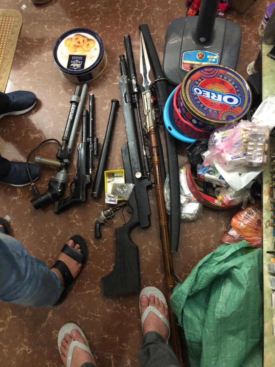 Ngoài ra, lực lượng công an còn thu giữ được 01 khẩu súng hơi tự chế bắn đạn bi dài khoảng 60cm; 01 khẩu súng tự chế bắn đạn bi, dài khoảng 50cm; 01 khẩu súng tự chế dạng côn xoay, dài khoảng 15cm, bên trong ổ đạn có 02 viên đạn kim loại tự chế; 01 kiếm bằng kim loại, dài khoảng 70cm; 01 kiếm bằng kim loại, dáng cong, dài khoảng 150cm; 01 thanh giáo nhọn, dài khoảng 190cm và 05 viên đạn tự chế cùng 01 túi nilon chứa nhiều viên đạn bi, đường kính mỗi viên khoảng 3mm.