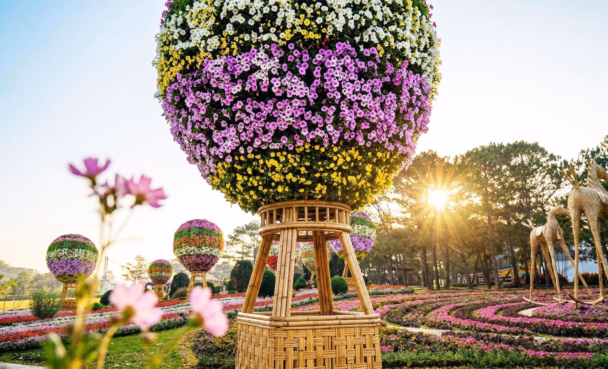 Đặc biệt, ấp ủ từ những “giấc mơ hoa” của phố sương Đà Lạt, Thung lũng Tình yêu vừa có thêm vườn hoa diệu kỳ với hình ảnh toa tàu, nàng thơ ôm đàn hay những quả khinh khí cầu kết từ hàng ngàn sắc hoa. Tại đây, du khách không chỉ ngắm hoa mà còn như lạc vào một giấc mơ hoa sống động giữa đời thực.