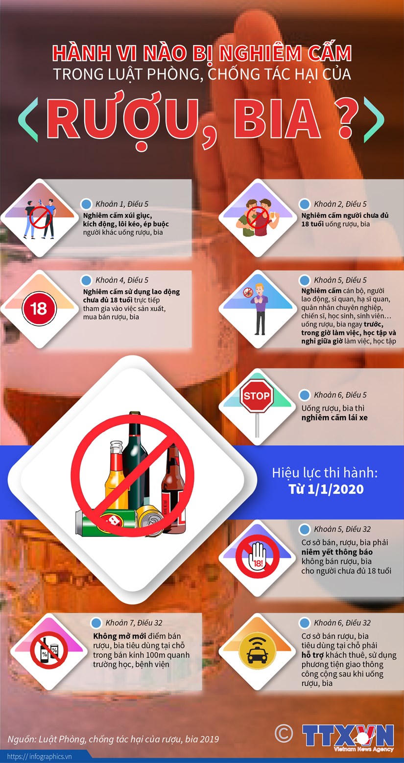 Luật Phòng, chống tác hại của rượu, bia có hiệu lực từ 1/1/2020, theo đó nghiêm cấm xúi giục, kích động, lôi kéo, ép buộc người khác uống rượu bia.