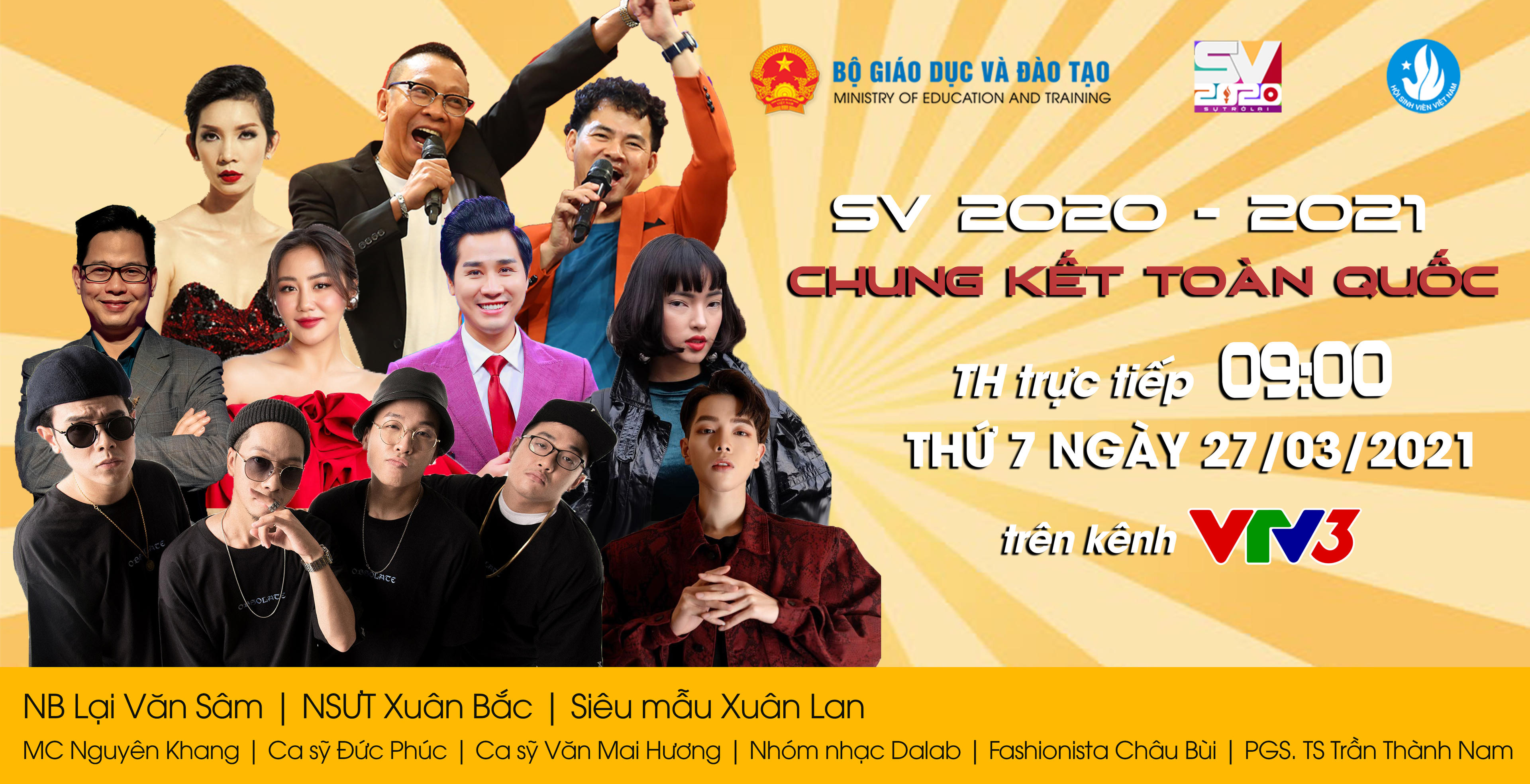 Bên cạnh 3 vị giám khảo thân quen của chương trình là nhà báo Lại Văn Sâm, NSUT Xuân Bắc và PGS.TS Trần Thành Nam, Chung kết SV 2020 - 2021 hứa hẹn sẽ bùng nổ và nóng hơn bao giờ hết nhờ sự góp mặt của các khách mời từ Nam ra Bắc. Sự xuất hiện của những nghệ sĩ trẻ như ca sĩ Đức Phúc, ca sĩ Văn Mai Hương, nhóm nhạc DaLAB, Fashionista Châu Bùi… sẽ khiến cho chung kết SV vô cùng rực rỡ và náo nhiệt. Người sẽ dẫn dắt trận chung kết lần này là MC Nguyên Khang và một gương mặt trẻ đã chiến thắng trong cuộc thi Gương mặt SV được tổ chức trên VTVgo, với hơn 4 triệu lượt bình chọn.