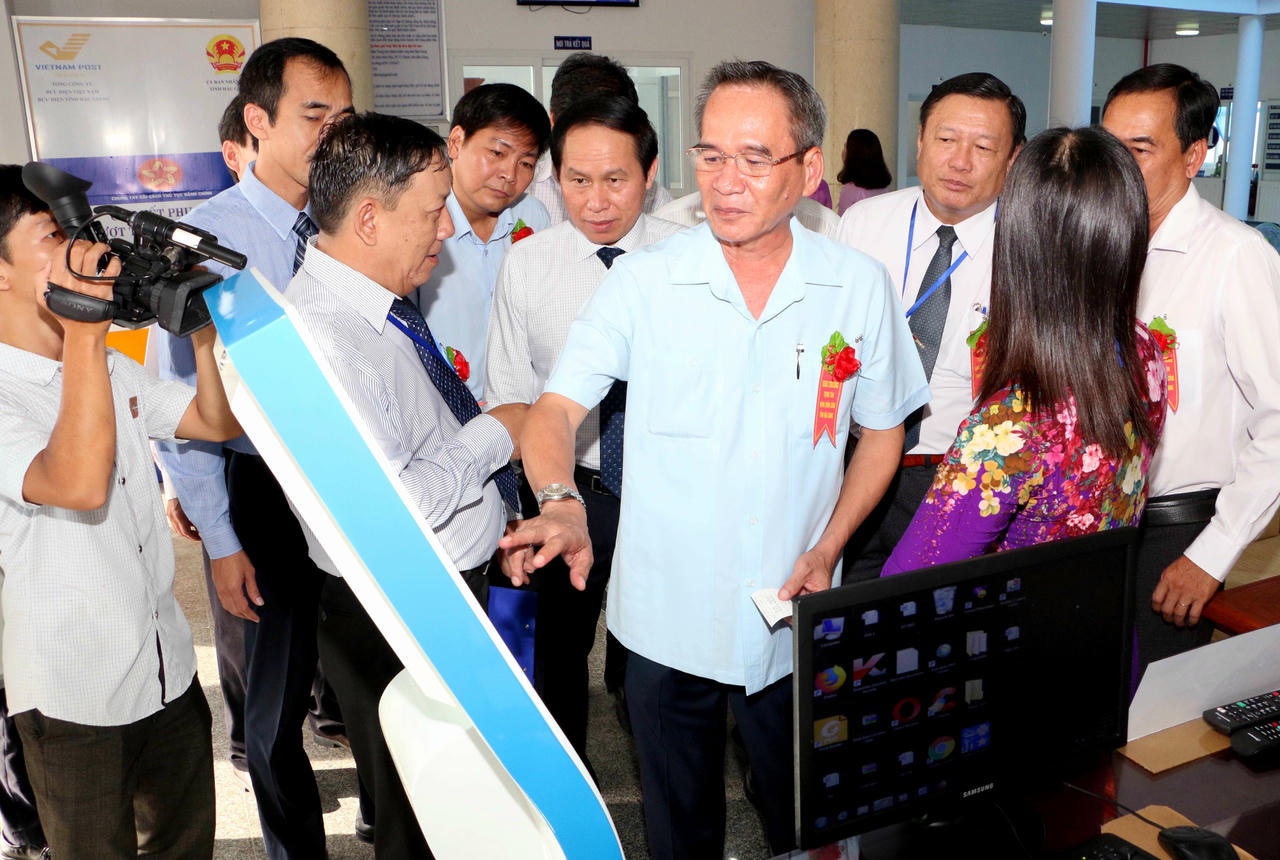 | Bí thư tỉnh ủy và Chủ tịch UBND tỉnh Hậu Giang kiểm tra cơ sở vật chất thực hiện thủ tục hành chính tại Trung tâm hành chính công của tỉnh. |