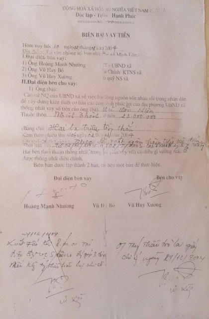 Tiếp đó, UBND có thông báo là giá đất lên nên những gia đình đã đóng tiền mua đất trước đó phải đóng thêm tiền. Ngày 30/04/2003 , ông Vũ Văn Niên có lên UBND xã thì được ông Nhường chấp thuận đóng thêm 3 triệu đồng. Tổng 2 lần 05/04 và 30/04/2003 thì UBND xã đã thu của gia đình ông Vũ Văn Niên 23 triệu đồng với lời hứa sẽ bán cho một lô đất 150 m2.