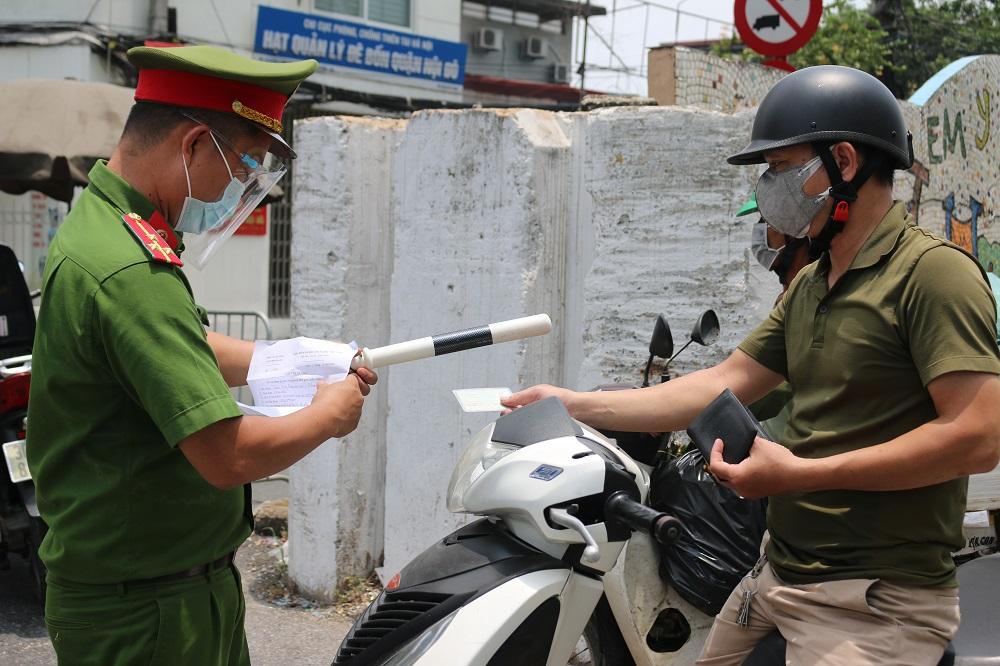 Thượng uý Hoàng Xuân Thành làm nhiệm vụ kiểm tra giấy tờ người đi đường tại điểm trực chốt. Ảnh: Ngọc Nga |