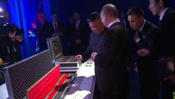 (PLVN) - Nhà lãnh đạo Triều Tiên Kim Jong-un đã tặng một thanh kiếm truyền thống của Triều Tiên cho Tổng thống Nga Vladimir Putin, trong khi lãnh đạo Nga tặng người đồng cấp thanh gươm của Nga và một cặp kính mạ vàng được chế tác bằng tay.