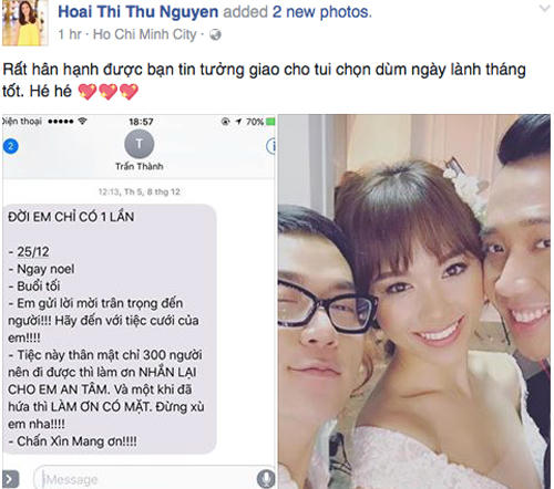 Theo nội dung của tin nhắn, đám cưới cặp đôi Trấn Thành - Hari Won sẽ được tổ chức vào tối 25/12. Tiệc cưới này chỉ mời 300 người. Anh còn hài hước nhắn thêm: “Tiệc này thân mật chỉ 300 người nên đi được thì làm ơn nhắn lại cho em an tâm. Và một khi đã hứa thì làm ơn có mặt. Đừng xù em nha. Chấn Xìn mang ơn”.