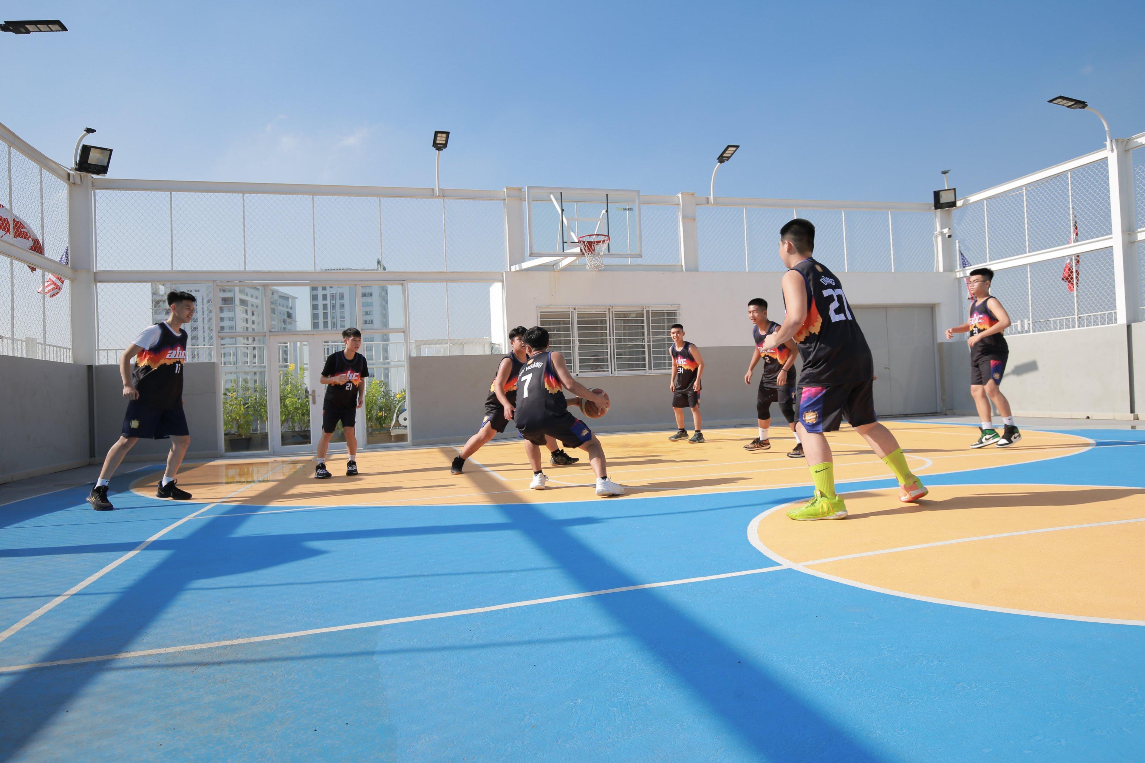 Học sinh khối phổ thông được tập luyện nhiều môn thể thao trong đó có bóng rổ. |