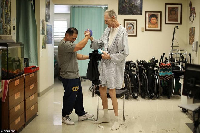 Phạm nhân Michael Patrick Rodriguez, 62 tuổi, bị ung thư da đang ngồi xem tivi: “Tôi sẽ đánh bại căn bệnh quái quỷ này. Dù bản thân mang tội nhưng tôi thực sự biết ơn các bác sĩ, y tá đã nhiệt tình chăm sóc, đặc biệt là những người như Kao Saephanh, cậu ấy thường xuyên giúp tôi vệ sinh cá nhân, tậm thể dục, thậm chí tới đây đọc truyện Harry Potter cho tôi bớt cô đơn và đau đớn”.