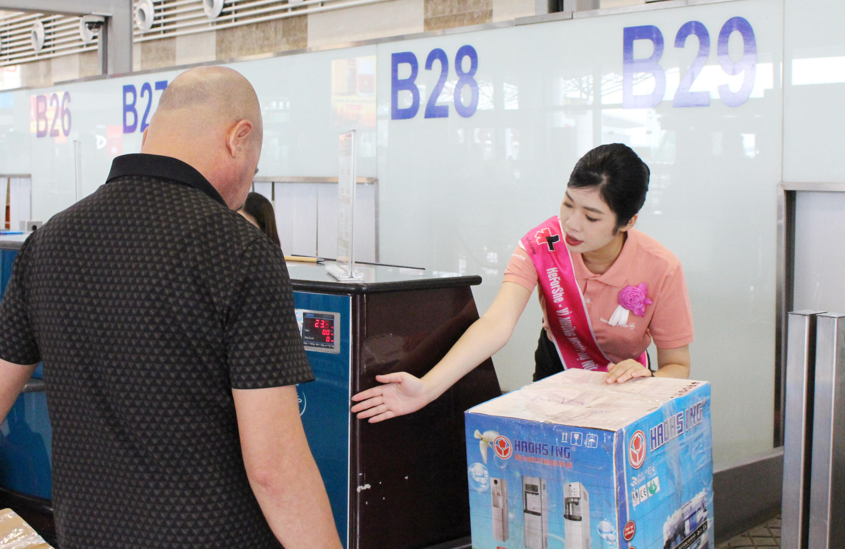 Đại diện Vietnam Airlines tặng báo cho các hành khách tham gia chuyến bay. |