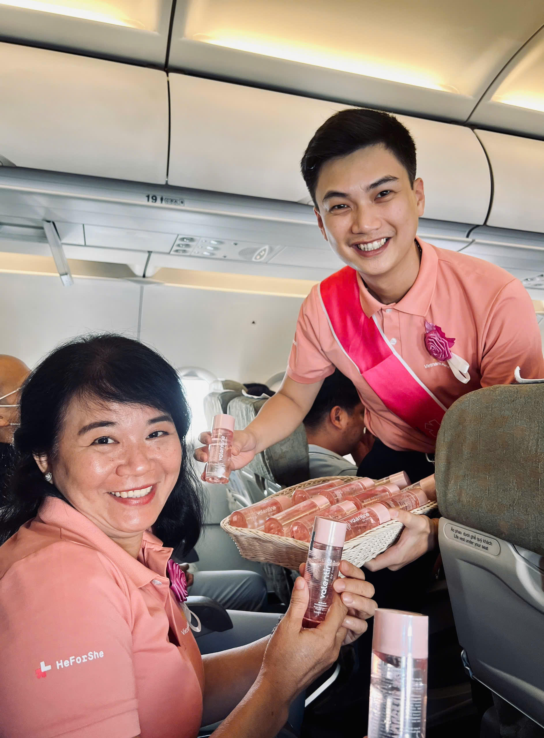 Tại chuyến bay hôm nay, tất cả các phi hành đoàn, các vị khách mời đều mặc trang phục có màu hồng. Các hành khách vô tình tham gia chuyến bay HeForShe - chuyến bay màu hồng Hà Nội - Cần Thơ sáng 1/10 - cũng được tặng một chiếc áo phông hồng, chai nước tẩy trang màu hồng xinh xắn cùng ly trà sữa ngọt ngào của Vietnam Airlines và 01 tờ báo có thông điệp Bình đẳng giới.