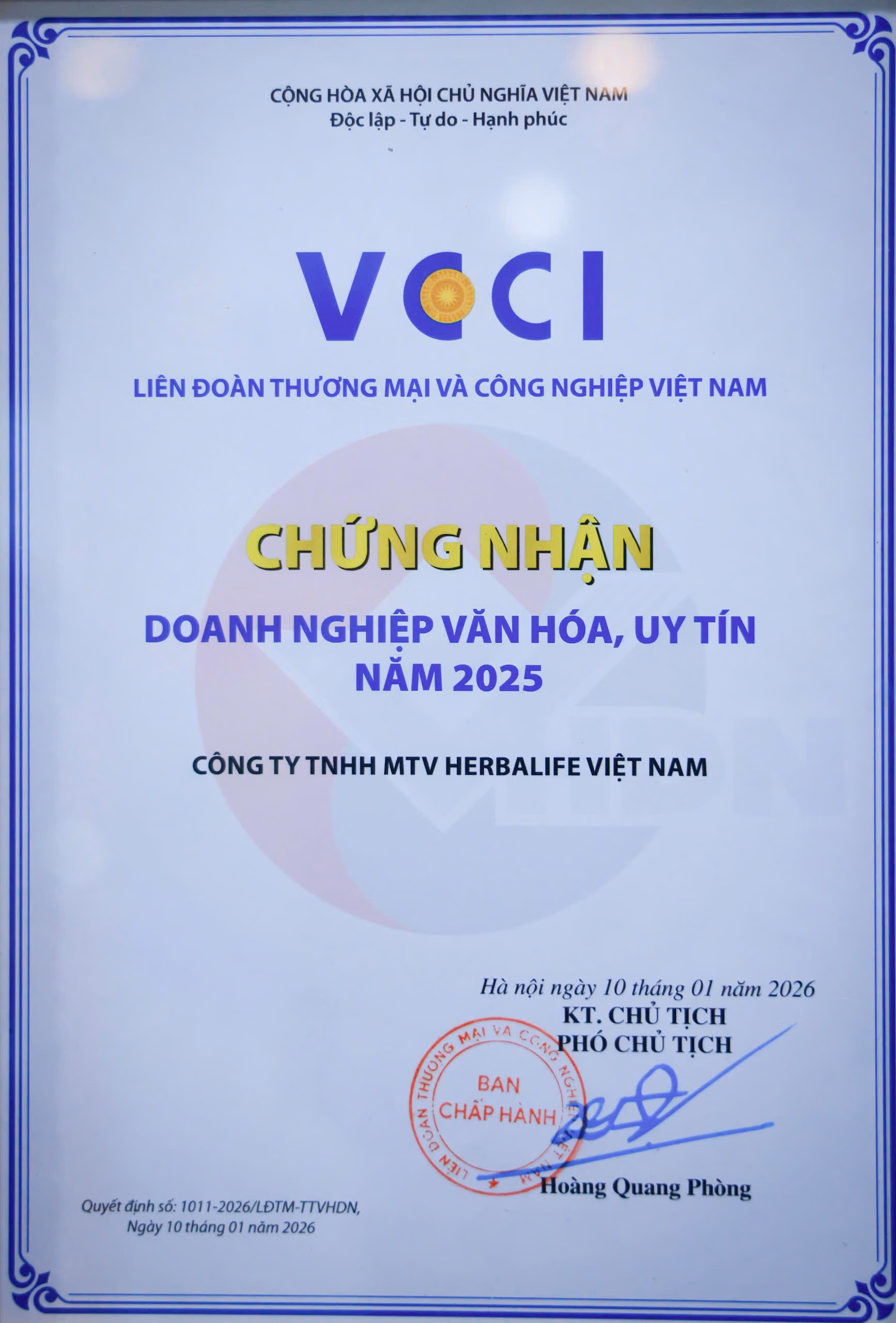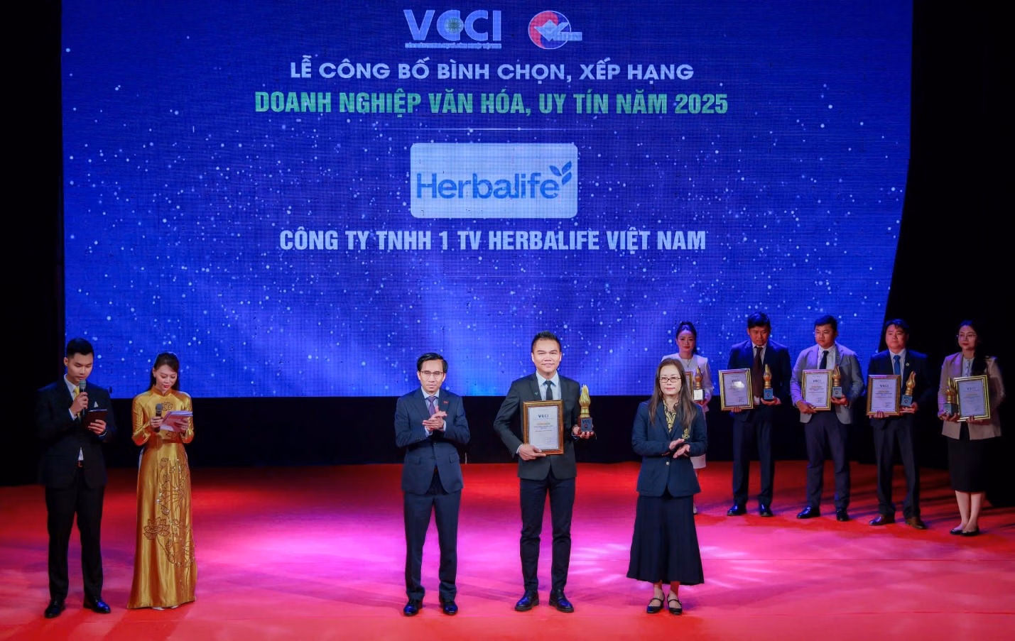 Ngày 10/01/2026, tại Hà Nội, Herbalife Việt Nam được Liên đoàn Thương mại và Công nghiệp Việt Nam (VCCI) vinh danh trong Top 100 Doanh nghiệp Văn hóa, Uy tín năm 2025, ghi nhận những nỗ lực bền bỉ của doanh nghiệp trong việc xây dựng văn hóa kinh doanh lành mạnh, gắn tăng trưởng với trách nhiệm xã hội và các giá trị đạo đức.