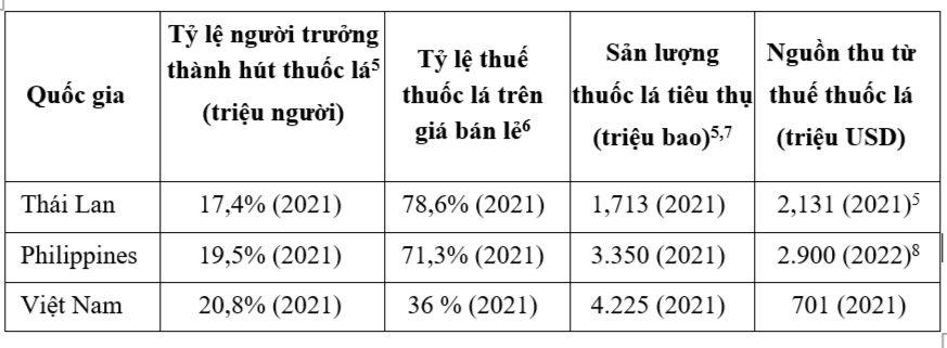 Cụ thể, sản lượng thuốc lá tiêu thụ ở Thái Lan ít hơn ½ so với sản lượng tiêu thụ ở Việt Nam (1,7 tỷ bao so với 4,2 tỷ bao) nhưng doanh số thu thuế từ thuốc lá lại cao gấp 3 lần (2.1 tỷ USD so với 767 triệu USD). Tương tự, sản lượng thuốc lá tiêu thụ ở Philipines thấp hơn đáng kể so với Việt Nam (3,35 tỷ bao so với 4,2 tỷ bao) nhưng doanh thu từ thuế cũng cao gấp hơn 4 lần (2,9 tỷ USD so với 767 triệu USD).
