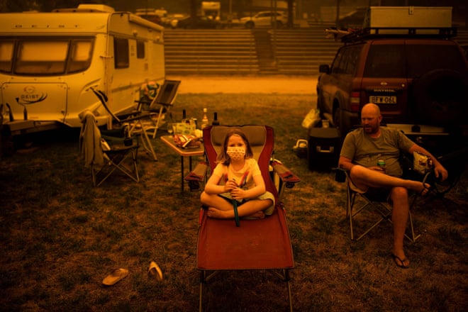 | Hai cha con Amy và Ben Spencer ngồi tại khu trưng bày ở thị trấn Bega phía nam New South Wales nơi họ đang cắm trại sau khi chạy trốn khỏi đám cháy. |