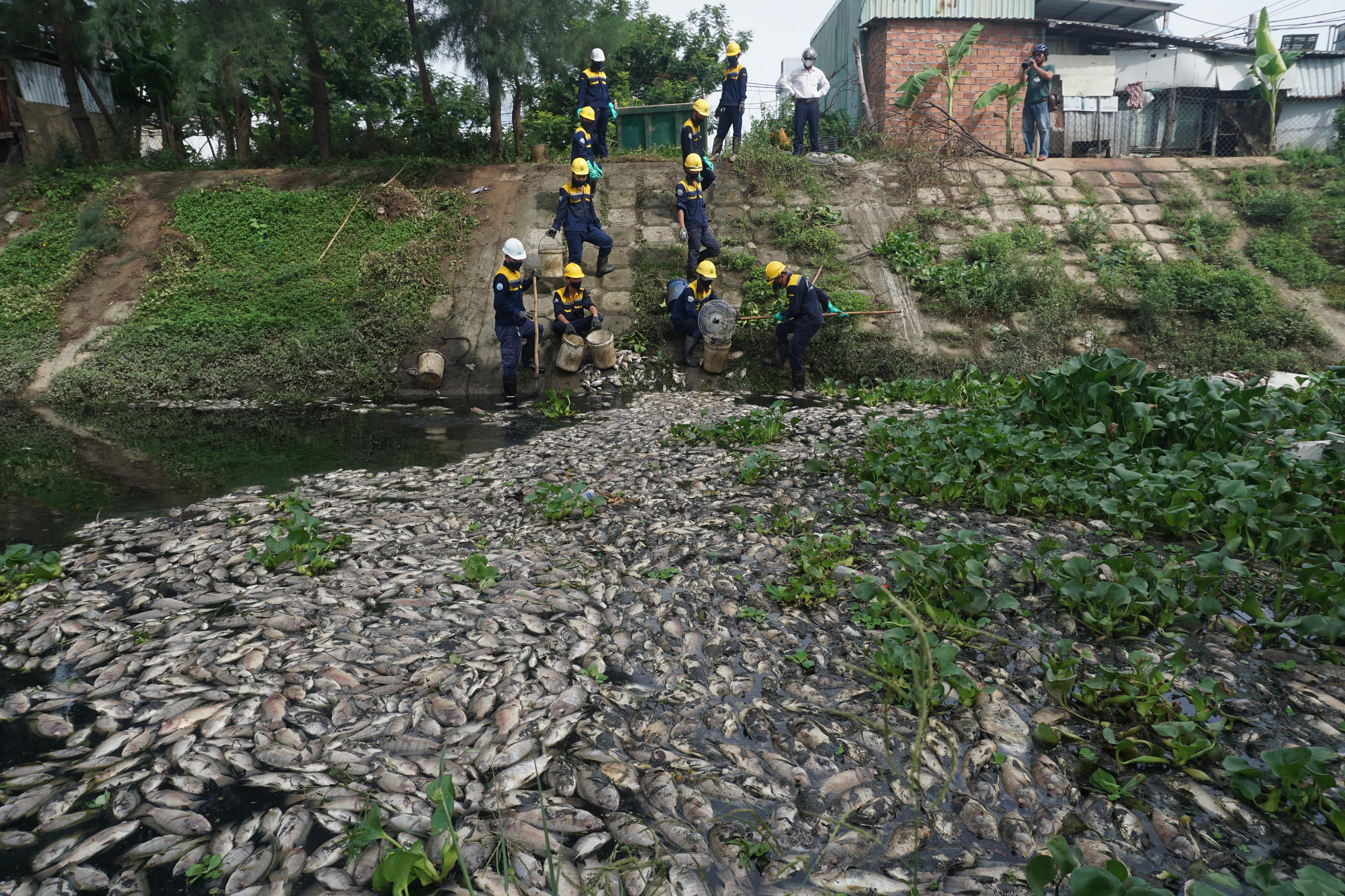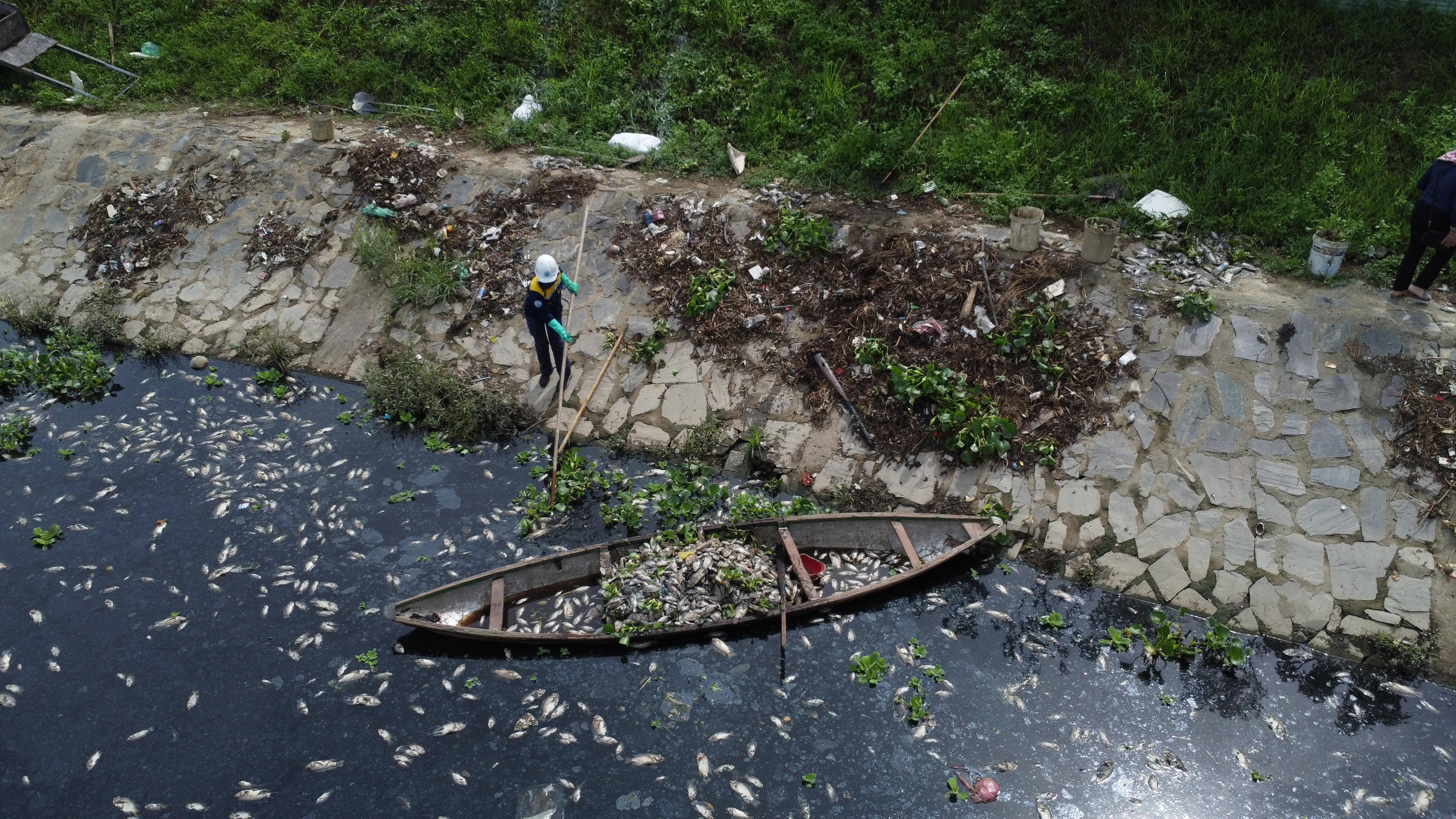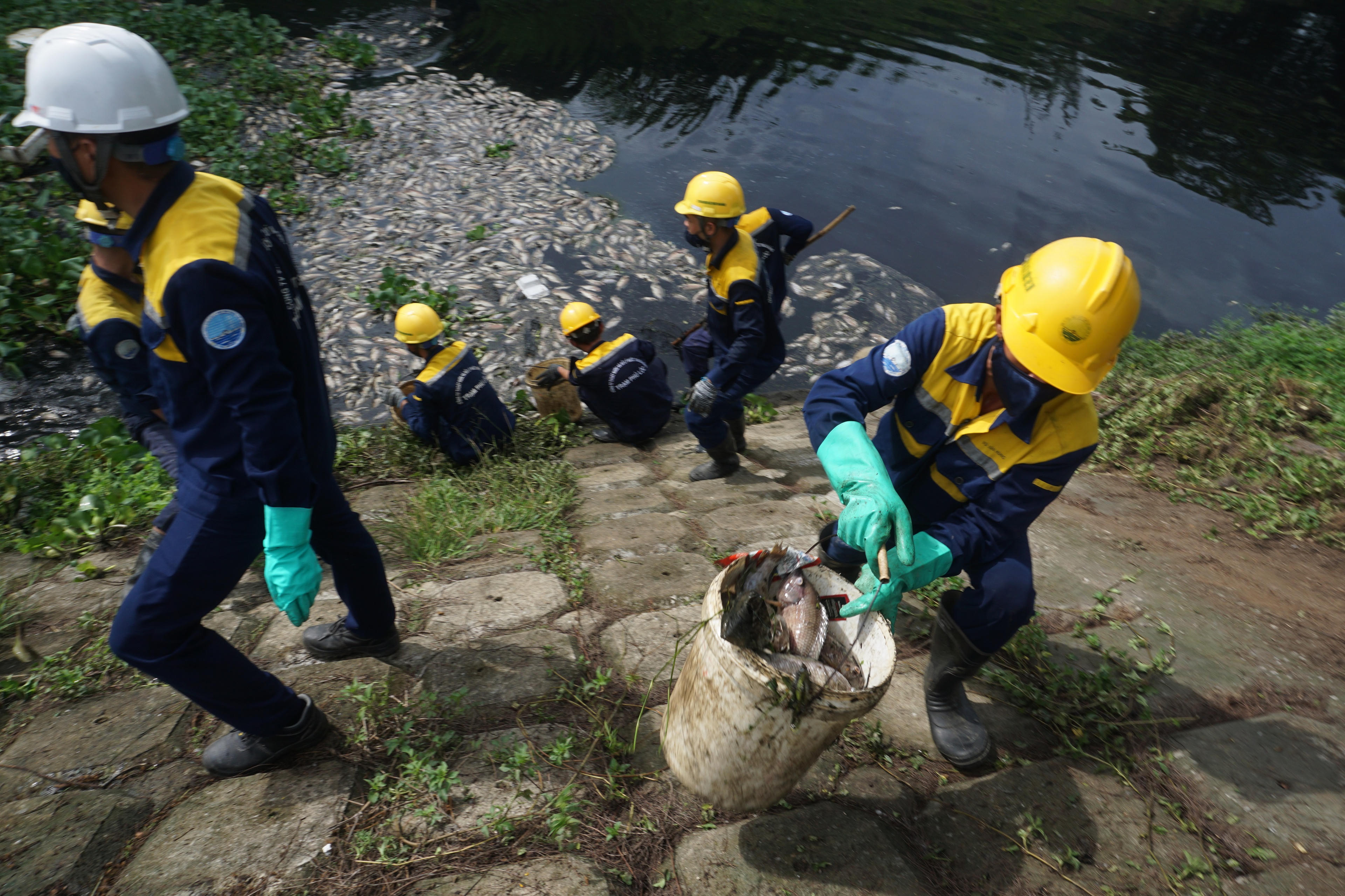Công nhân Công ty Thoát nước và xử lý nước thải TP Đà Nẵng vớt xác cá chết nổi trắng dưới kênh.