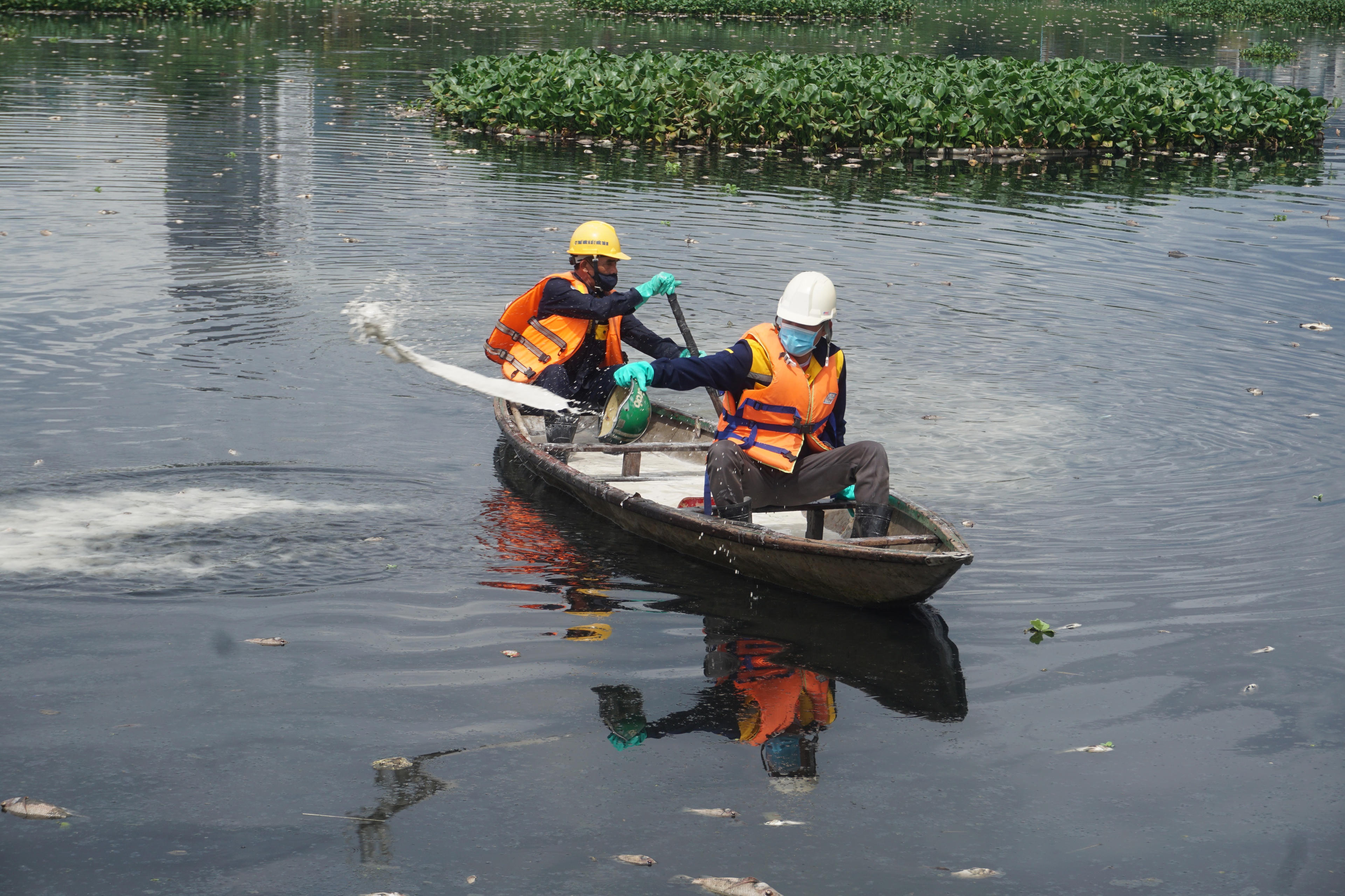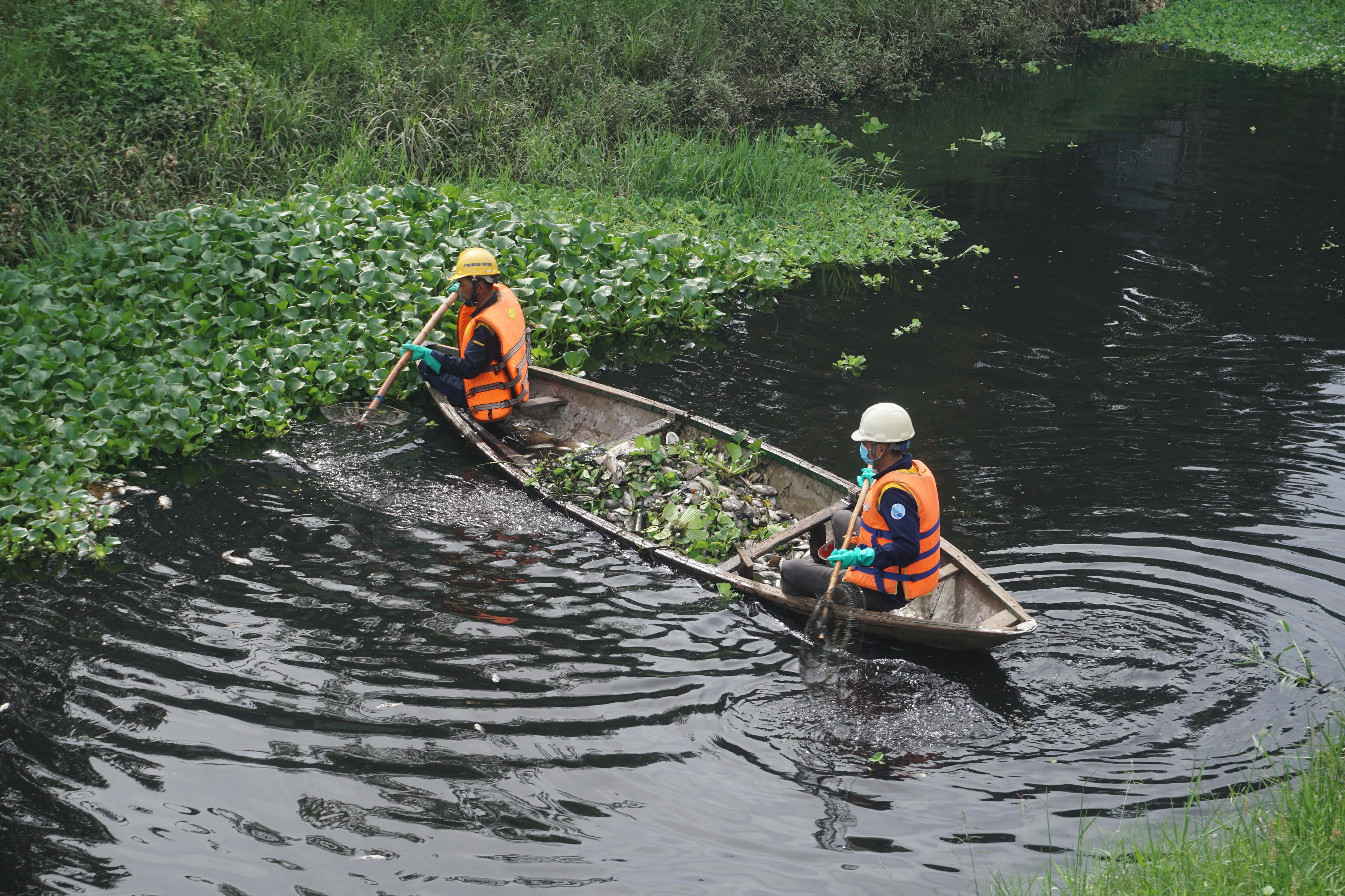 Công nhân dùng thuyền để vớt xác cá trôi nổi ở giữa kênh.