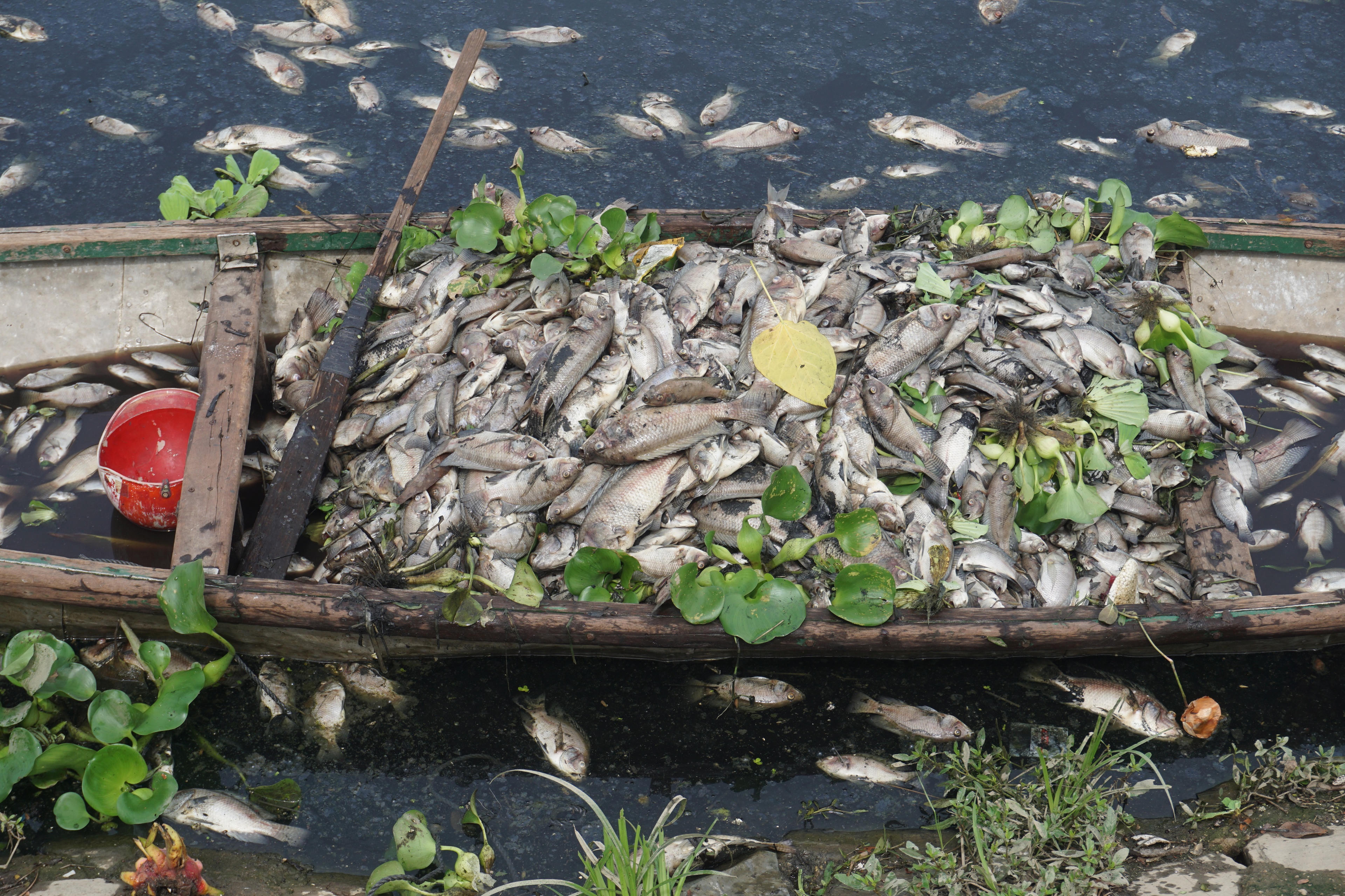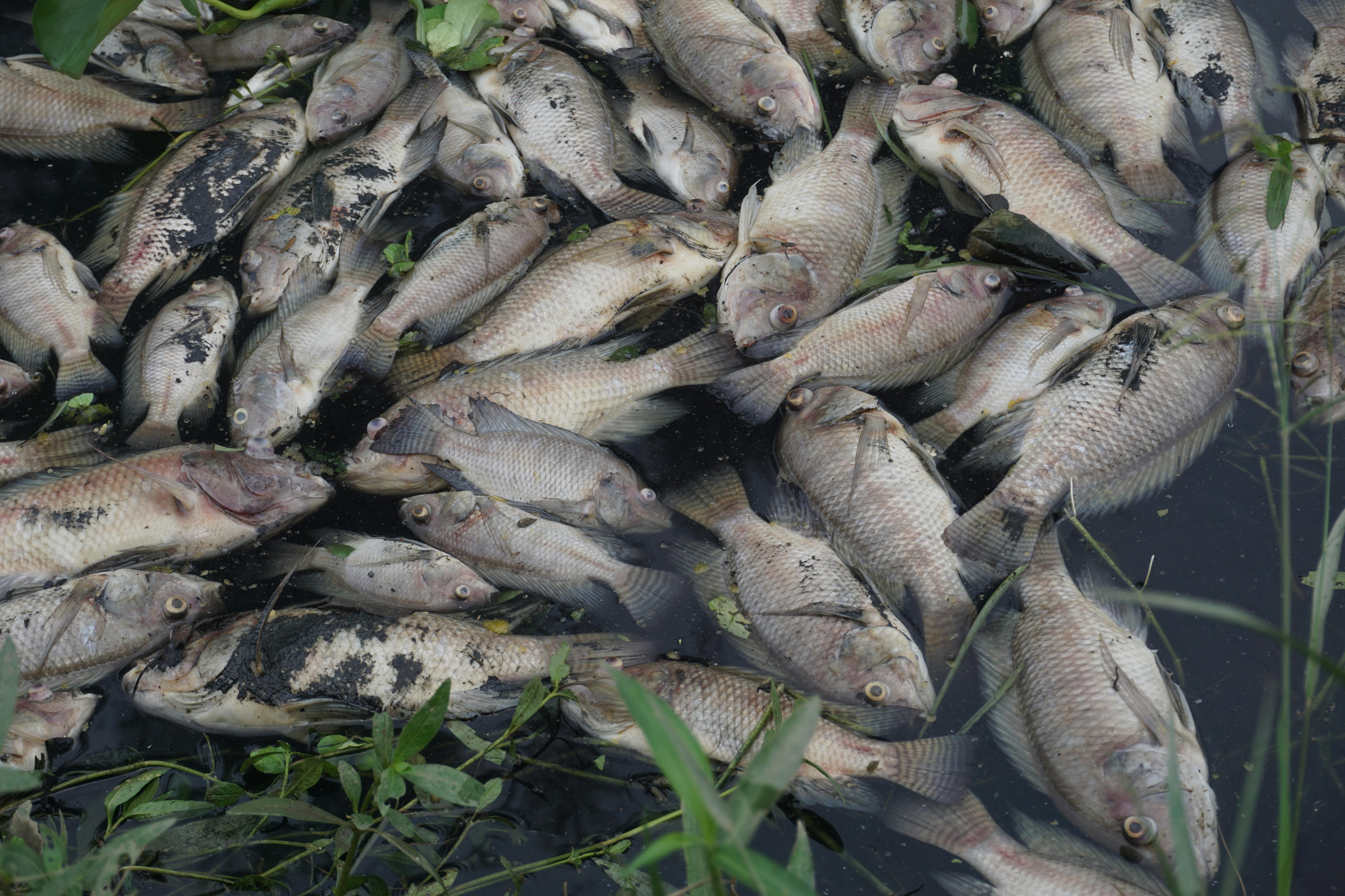 Cá chết chủ yếu là cá rô phi to bằng bàn tay. Xác cá đang trong giai đoạn phân hủy, nổi lềnh bềnh trên mặt nước đen ngòm.
