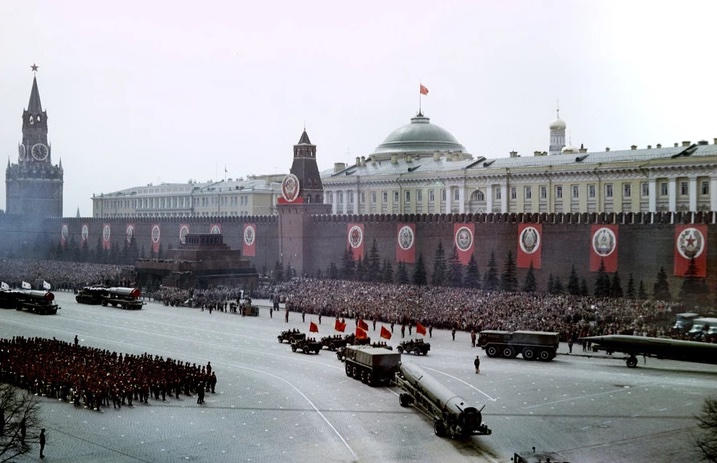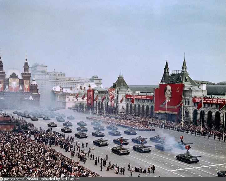 Vào ngày 9/5/1965, nhân kỷ niệm 20 năm chiến thắng, theo sáng kiến của Tổng Bí thư Đảng Cộng sản Liên Xô lúc bấy giờ là Leonid Brezhnev. Moscow đã chứng kiến cuộc duyệt binh Ngày Chiến thắng sau 20 năm. Ảnh: Pastvu.com.