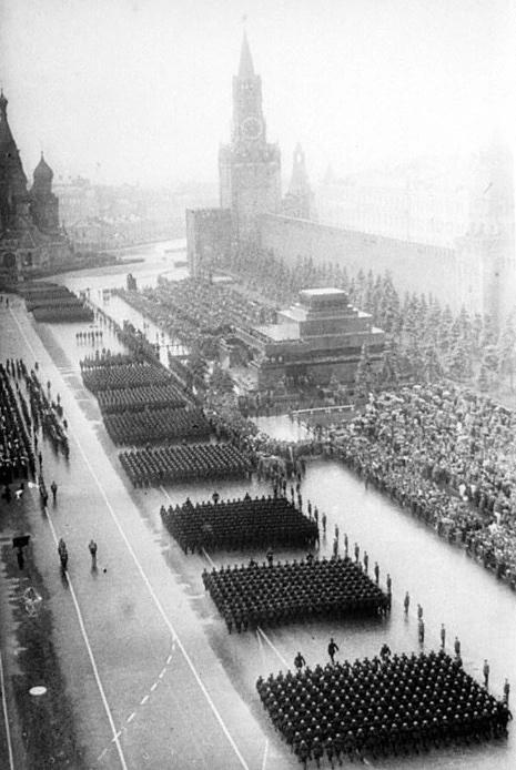 Theo một số báo cáo, đài phun nước ở phía trái hình ảnh được chế tạo riêng cho cuộc duyệt binh năm 1945. Ảnh: Pastvu.com.
