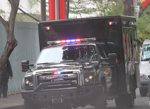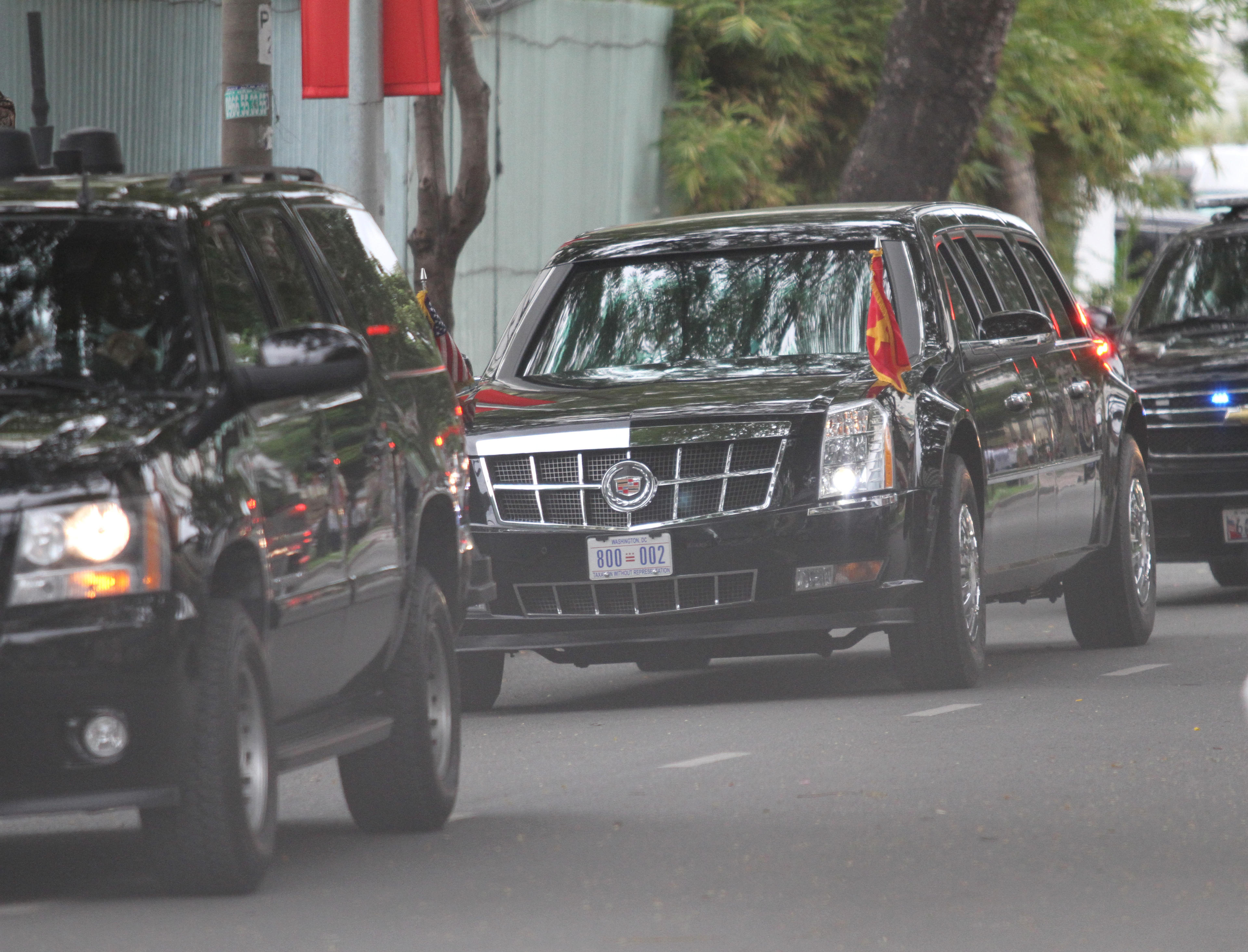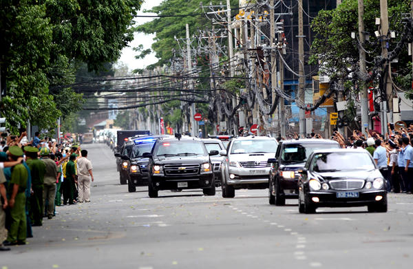 Đoàn xe chở Tổng thống Mỹ Barack Obama bắt đầu di chuyển từ tòa nhà GEM Center (Q.1, TP.HCM) ra sân bay Tân Sân Nhất. Ảnh: Dân trí |