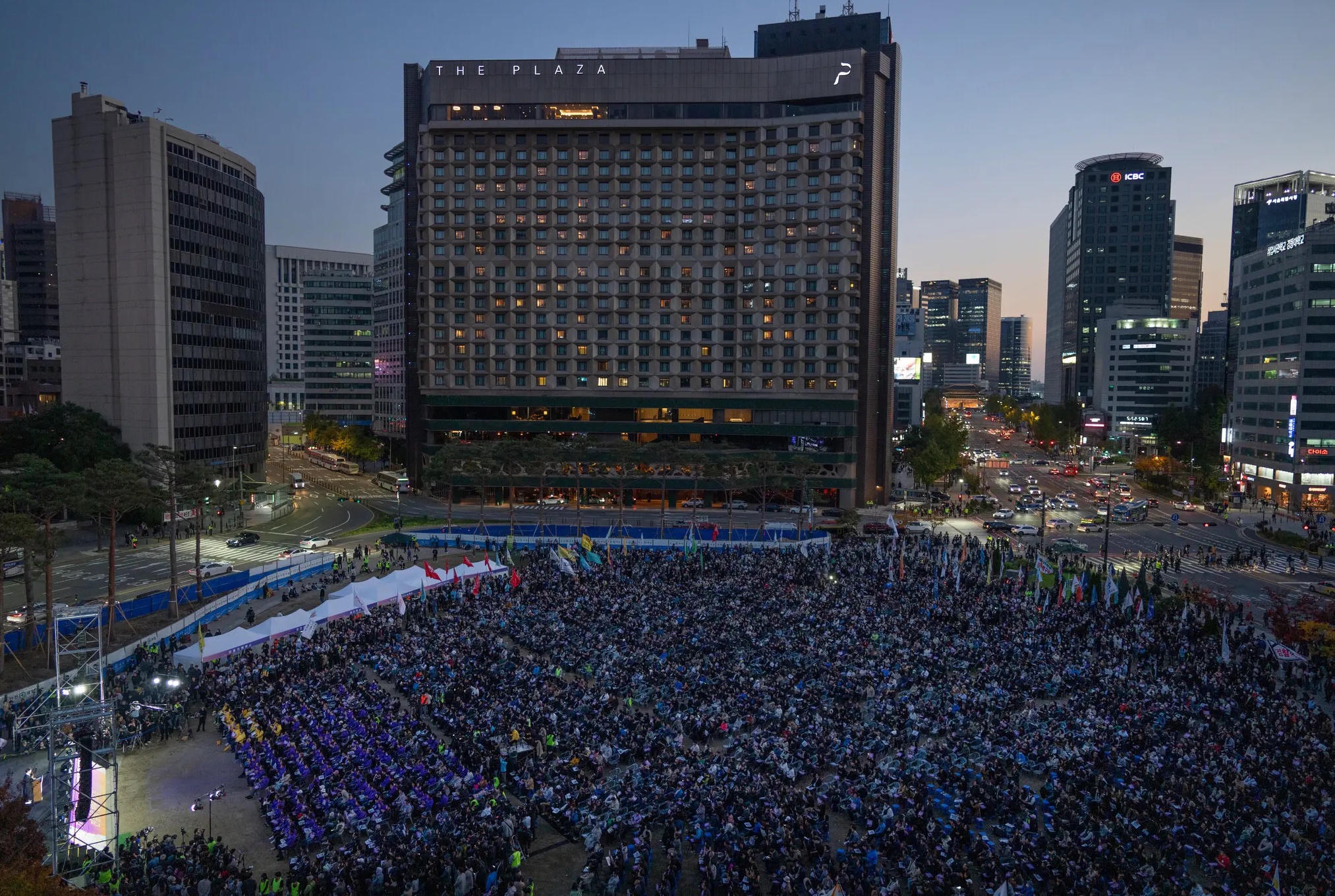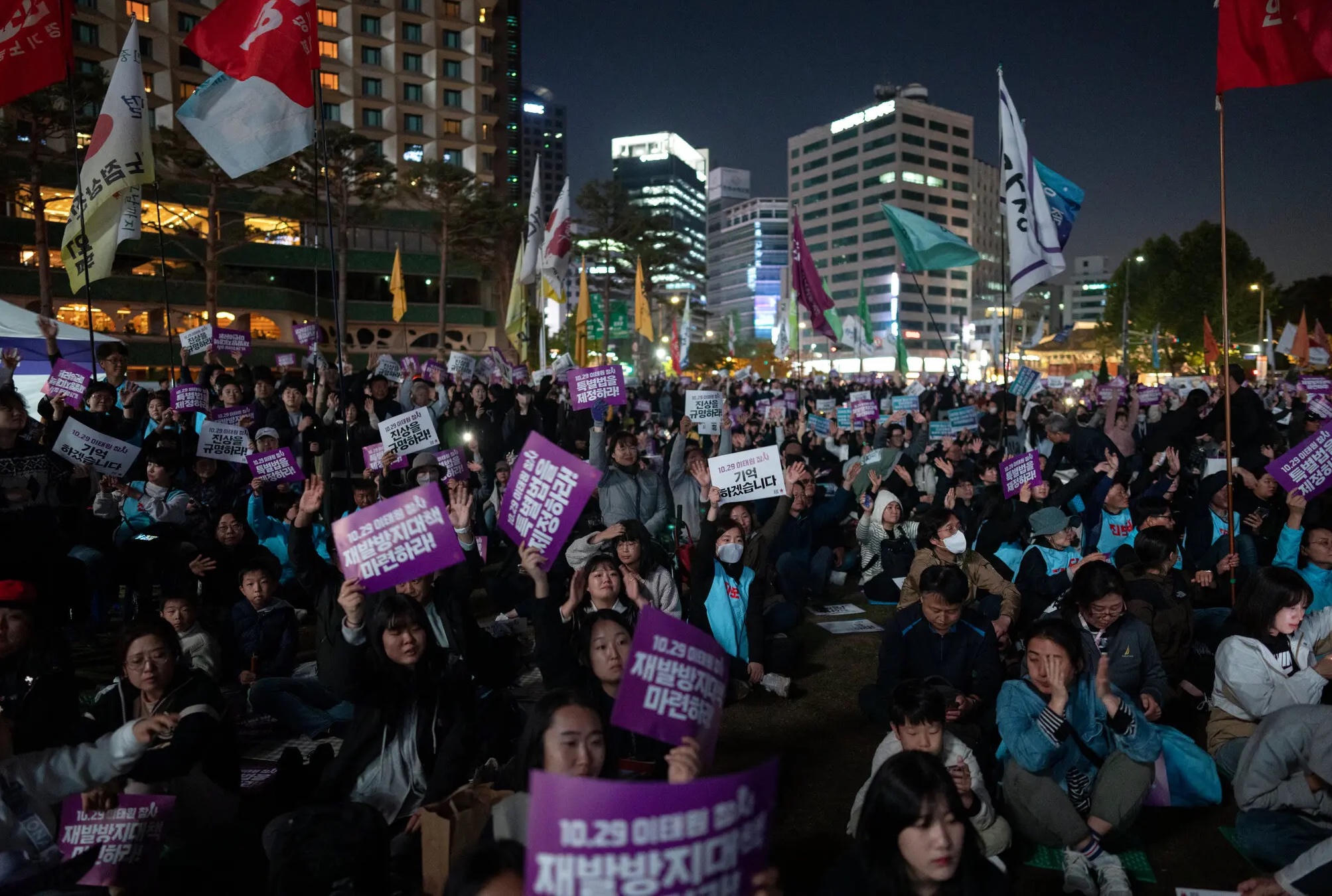 Khoảng 3.000 người tập trung trước tòa thị chính Seoul sau khi đến Itaewon để tưởng niệm các nạn nhân. Ảnh: The New York Times.