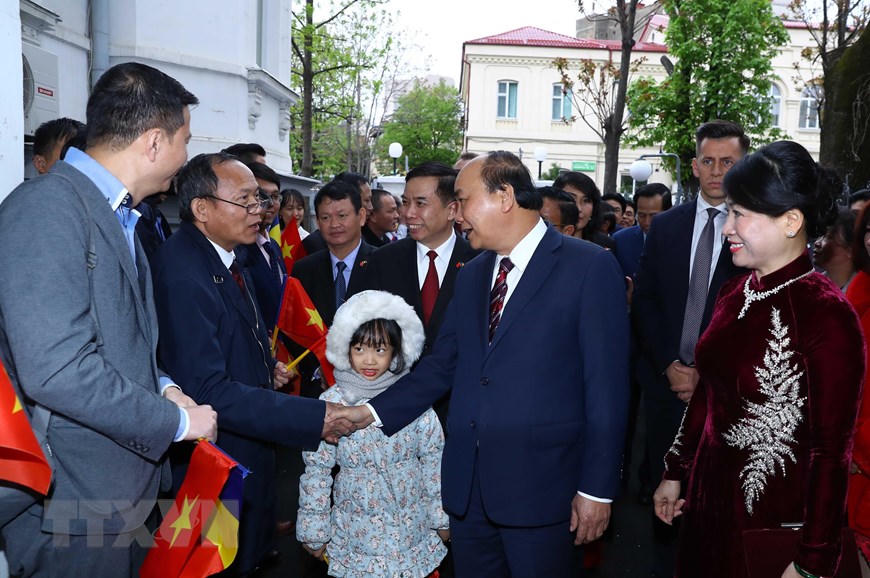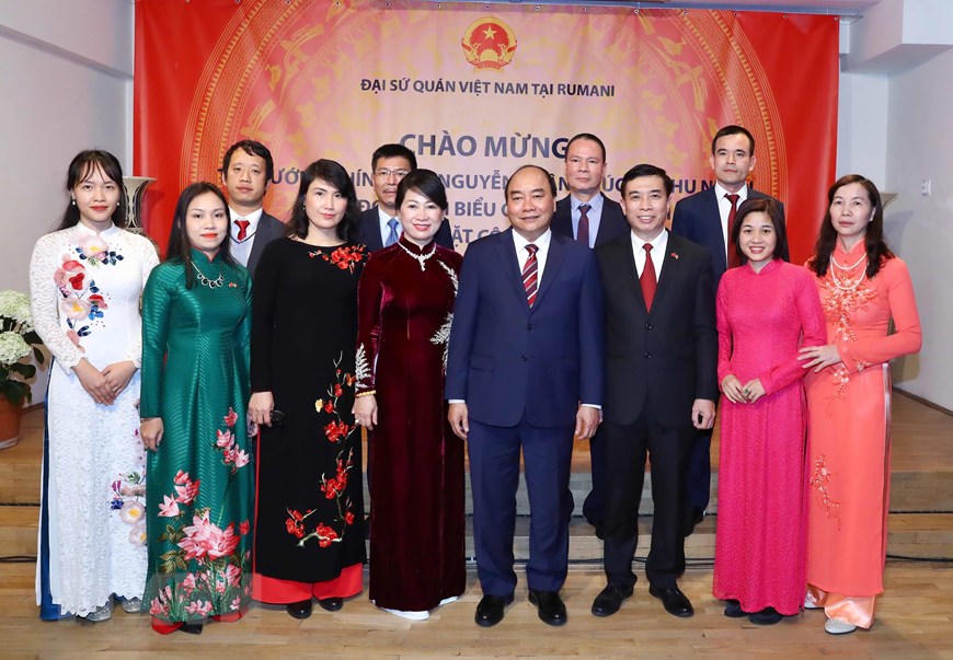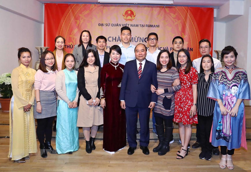 Thủ tướng Nguyễn Xuân Phúc và Phu nhân đến thăm và nói chuyện với cán bộ nhân viên Đại sứ quán và cộng đồng người Việt Nam tại Romania. (Ảnh: Thống Nhất/TTXVN)