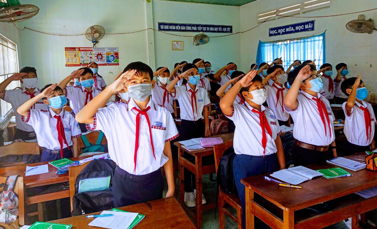 Học sinh Trường THCS Thị trấn Vĩnh Thạnh chào cờ tại lớp học sáng 1/3.