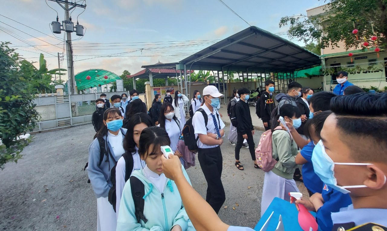 Tại Cần Thơ, học sinh đến trường cũng được đo thân nhiệt, sử dụng nước rửa tay. Ảnh: Báo Giáo dục và thời đại.