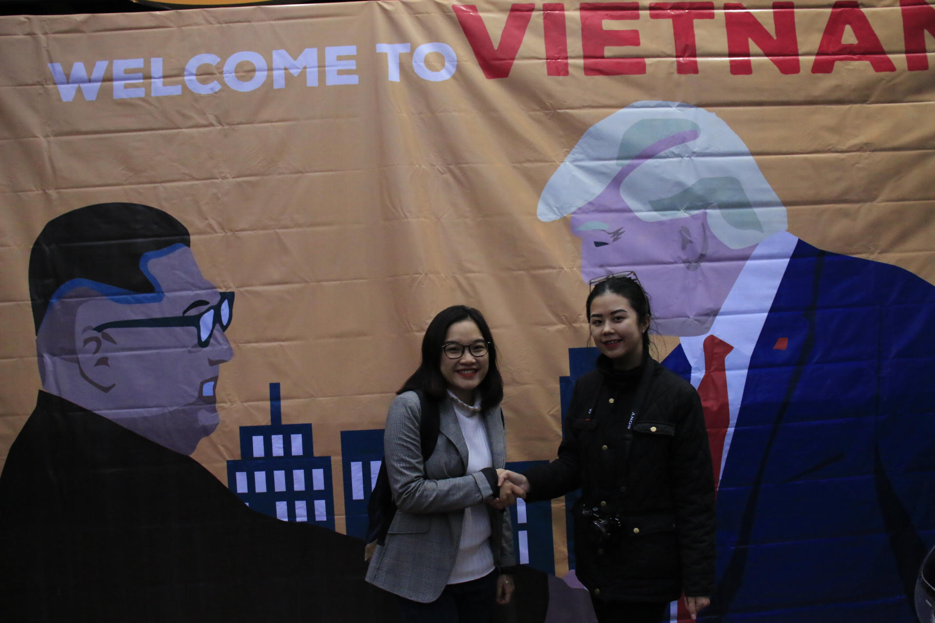 Anh Nguyễn Văn Quang, chủ một nhà hàng trên đường Đỗ Đức Dục treo loạt ảnh hai nhà lãnh đạo, với mong muốn tạo ấn tượng đặc biệt tới tất cả khách trong nước cũng như quốc tế. "Hi vọng ở một thành phố hòa bình như Hà Nội, hai bên sẽ đạt được kết quả tốt đẹp nhất”, anh Quang nói. Tấm áp phích được nhiều bạn trẻ tới check-in và chụp ảnh.