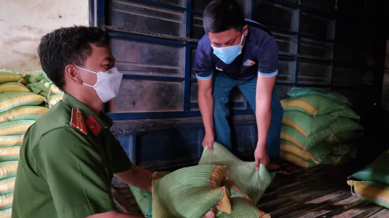 Trung tá Hồ Thái Hòa, Trưởng Công an xã Thiện Tân, huyện Vĩnh Cửu tham gia chuyển 3 tấn gạo thiện nguyện đến người dân xã Phú Lý |