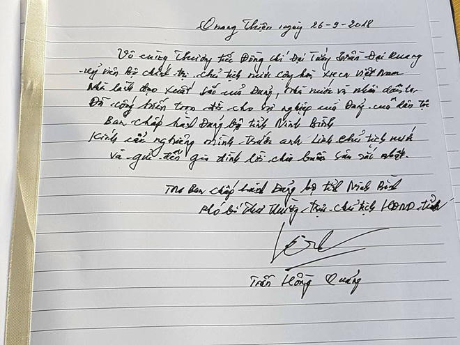 (PLO) - Sáng 26/9, đoàn lãnh đạo Tỉnh ủy, HĐND, UBND, UBMTTQ tỉnh Ninh Bình cùng đại diện lãnh đạo các sở, ban ngành, các đơn vị, tổ chức cùng đông đảo người dân trên địa bàn tỉnh đã tới viếng Chủ tịch Nước Trần Đại Quang tại quê nhà (xóm 13, xã Quang Thiện, huyện Kim Sơn, tỉnh Ninh Bình).