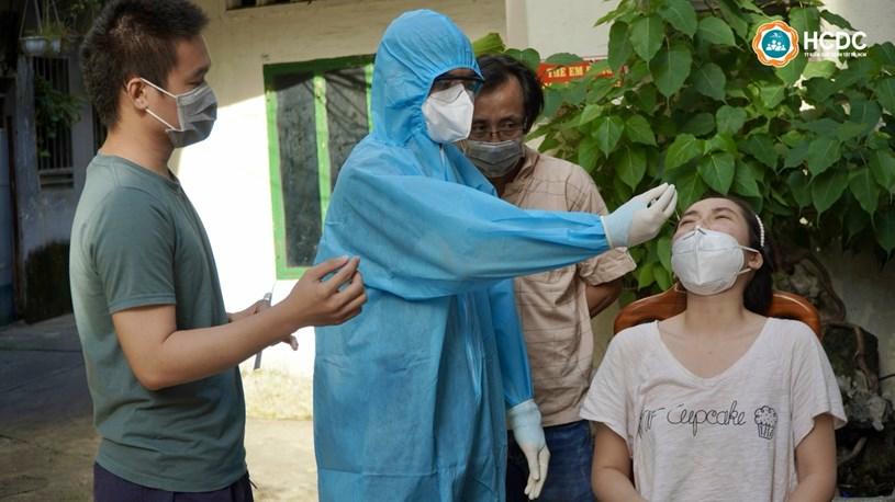Trung tâm kiểm soát bệnh tật TP HCM ghi lại hình ảnh người dân tự lấy mẫu xét nghiệm nhanh sau khi được nhân viên y tế hướng dẫn: