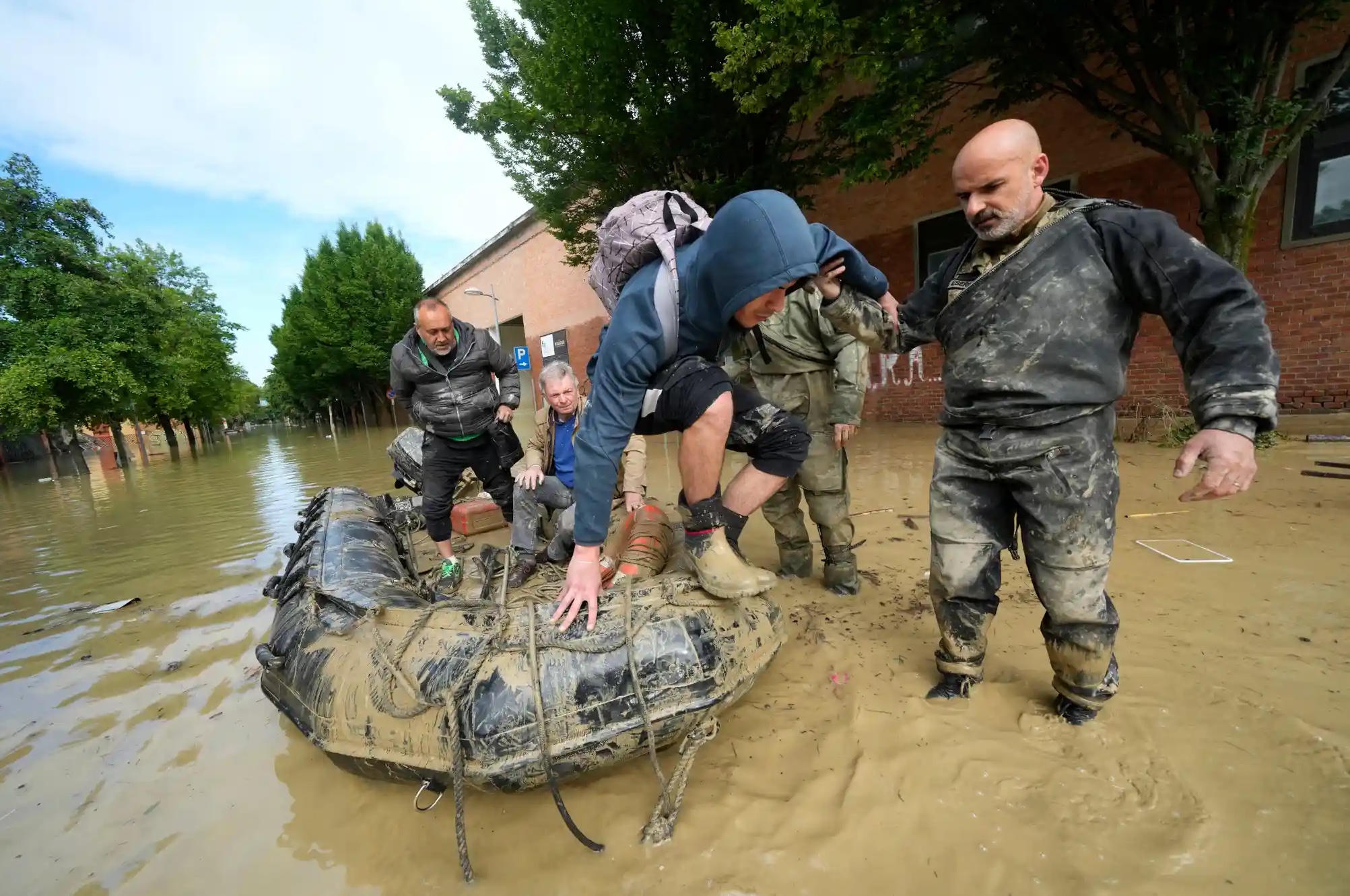 | Mọi người được giải cứu bằng thuyền ở thành phố Faenza. Ảnh: AP. |