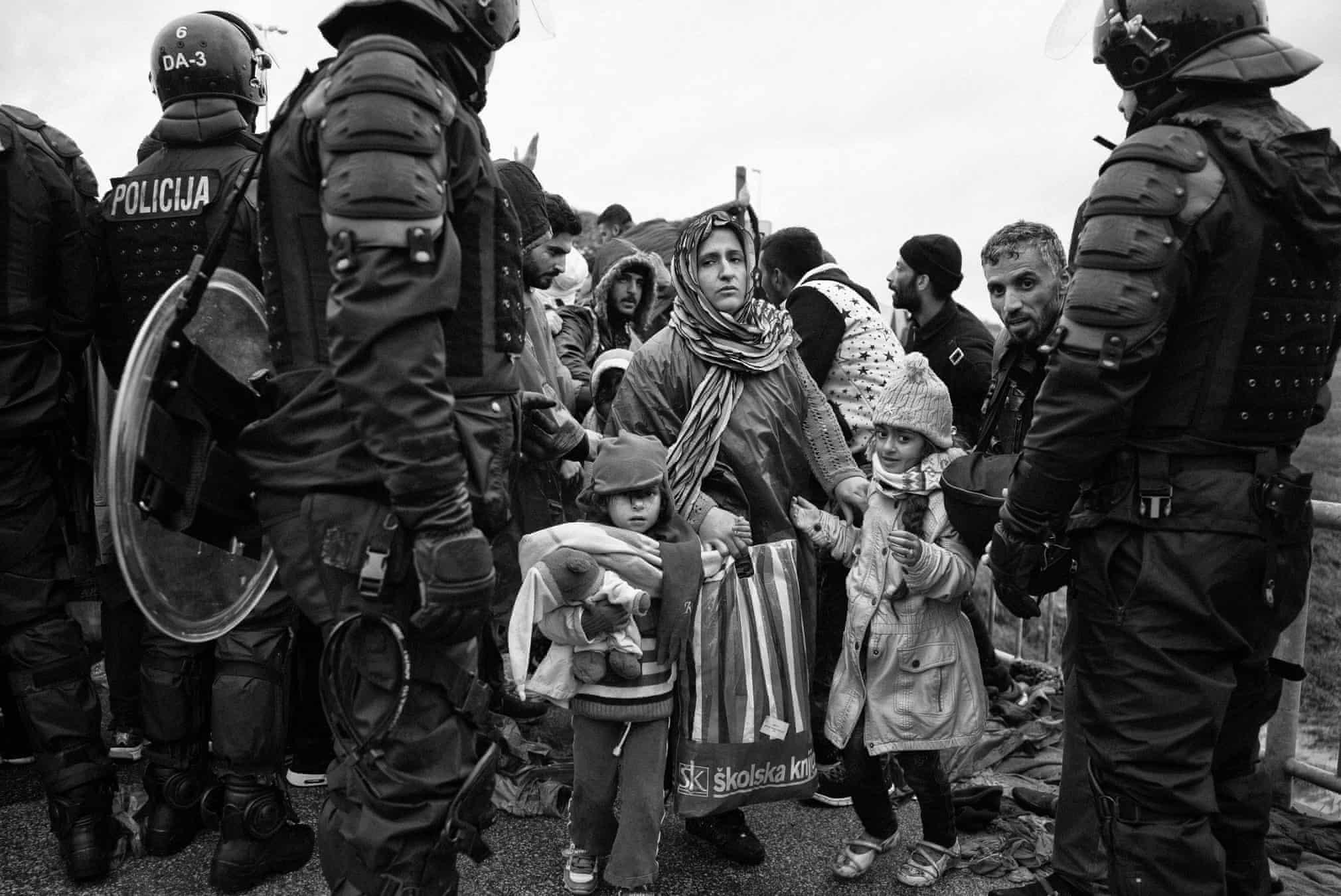 | Một người mẹ dẫn con mình đi qua hàng rào của cảnh sát Slovenia tại cửa khẩu Timovec với Croatia. |