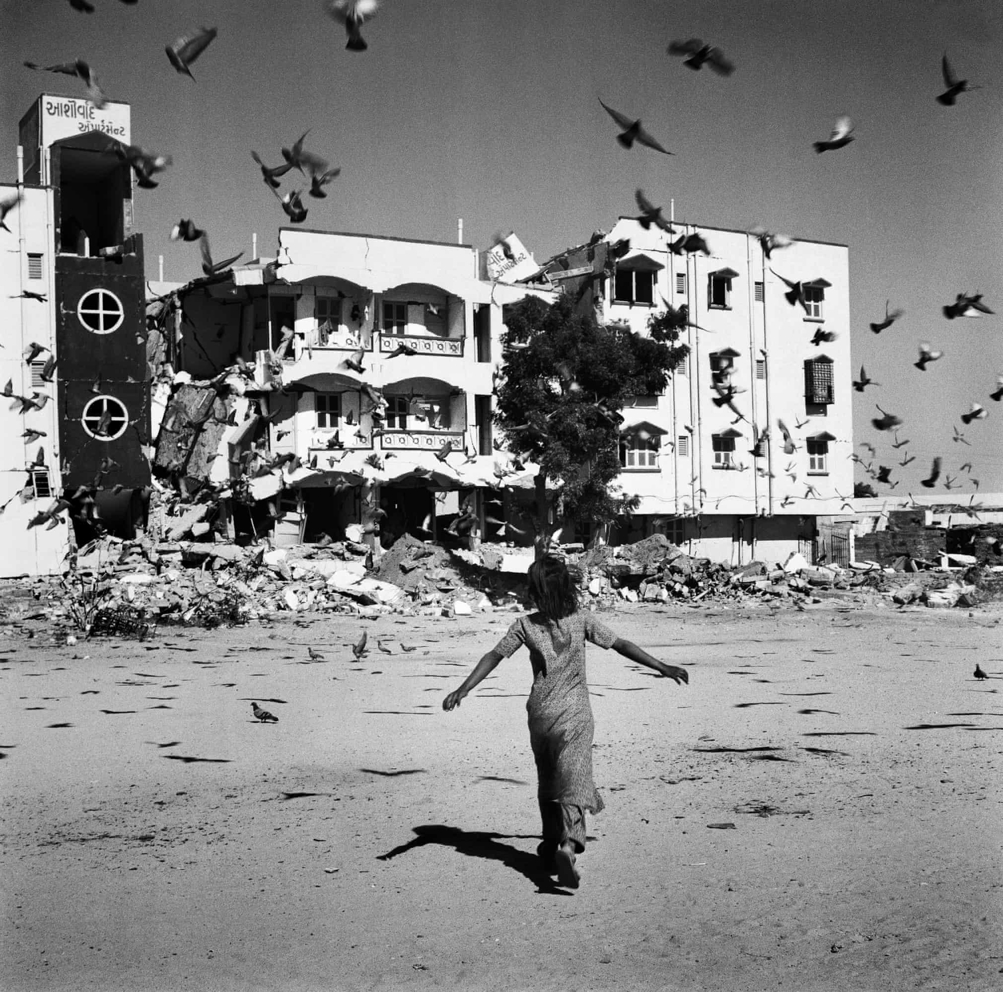 | Một bà lão chờ viện trợ để đến ngôi làng bị nạn của mình gần Anjar, Gujarat, sau trận động đất năm 2001. |
