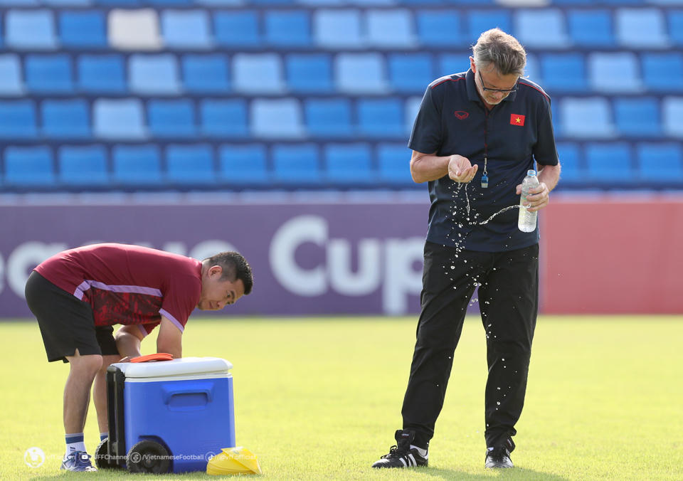 Thời tiết nắng nóng khiến ông Troussier luôn phải dội nước trong khi hướng dẫn tập luyện cùng học trò (ảnh VFF) |