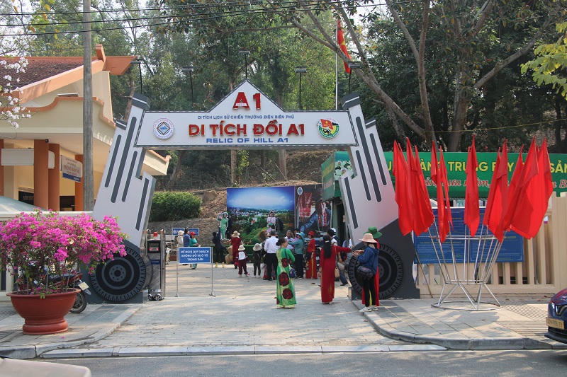Cổng vào di tích đồi A1 được trang trí cờ, hoa rực rỡ. |