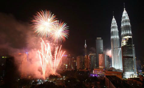 Pháo hoa rực sáng gần tòa tháp đôi Petronas - biểu tượng của thủ đô Kuala Lumpur, Malaysia.