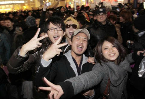 Những thanh niên Nhật Bản phấn khích trong lễ đón chào năm mới tại quận Shibuya, Tokyo, Nhật Bản. Hàng nghìn người dân đổ ra các đường phố ở thủ đô Tokyo để cùng chung niềm vui đón chào năm mới 2012.