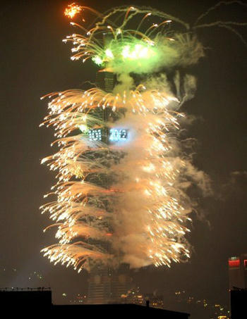 Màn pháo hoa rực rỡ trên tòa tháp Đài Bắc 101. Một đồng hồ đếm ngược khổng lồ là tâm điểm chú ý để hàng trăm nghìn người dõi theo, bất chấp những cơn gió lạnh ngày cuối năm.