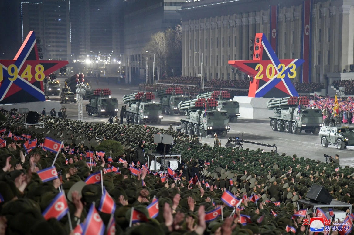 Cuộc duyệt binh chào mừng 75 năm thành lập quân đội Triều Tiên diễn ra sau nhiều tuần chuẩn bị, với sự tham gia của đông đảo binh lính và người dân để tôn vinh nhà lãnh đạo của nước này. Ảnh: AP. |