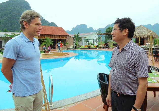 Ông Trần Tiến Dũng - Phó chủ tịch UBND tỉnh Quảng Bình (phải) nghe ông Tom Malinowski – Trợ lý Ngoại trưởng Mỹ chia sẻ những cảm xúc sau chuyến đi. |