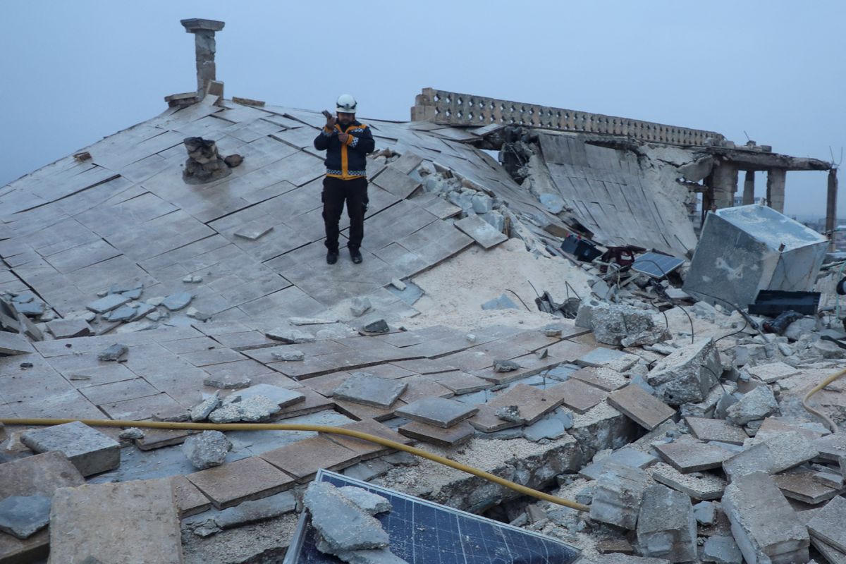 Một nhân viên cứu hộ làm việc tại một tòa nhà bị sập ở Azaz, Syria. Ảnh: REUTERS.